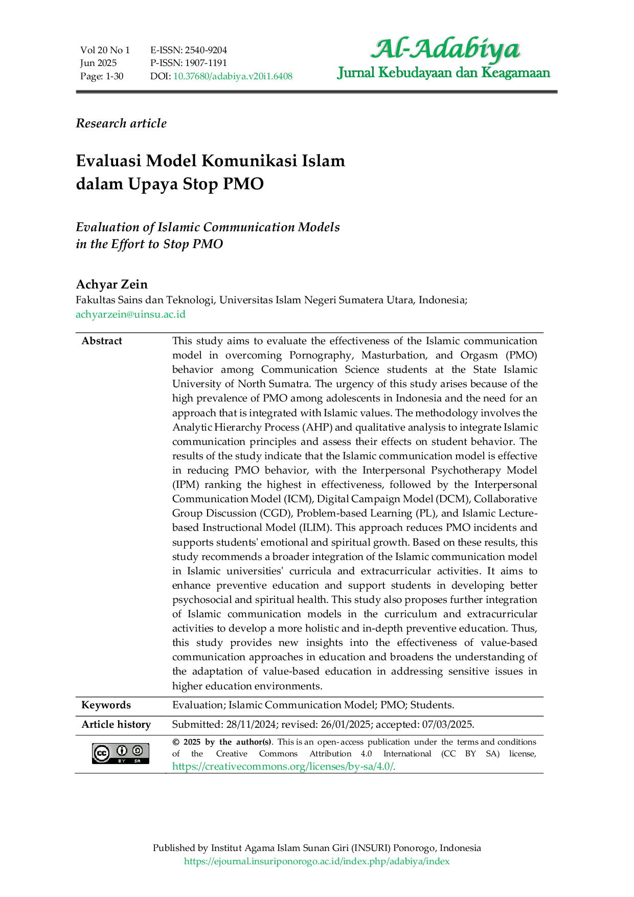 Al-Adabiya: Jurnal Kebudayaan dan KeagamaanAl-Adabiya: Jurnal Kebudayaan dan KeagamaanPenelitian ini bertujuan untuk mengevaluasi efektivitas model komunikasi Islam dalam mengatasi perilaku Pornografi, Masturbasi, dan Orgasme (PMO) di kalangan mahasiswa Ilmu Komunikasi Universitas Islam Negeri Sumatera Utara. Urgensi penelitian ini muncul karena tingginya prevalensi PMO di kalangan remaja di Indonesia dan kebutuhan akan pendekatan yang terintegrasi dengan nilai-nilai Islam. Metodologi penelitian melibatkan Analytic Hierarchy Process (AHP) dan analisis kualitatif untuk mengintegrasikan prinsip-prinsip komunikasi Islam serta menilai dampaknya terhadap perilaku mahasiswa. Hasil penelitian menunjukkan bahwa model komunikasi Islam efektif dalam mengurangi perilaku PMO, dengan Interpersonal Psychotherapy Model (IPM) menempati peringkat tertinggi dalam efektivitas, diikuti oleh Interpersonal Communication Model (ICM), Digital Campaign Model (DCM), Collaborative Group Discussion (CGD), Problem-based Learning (PL), dan Islamic Lecture-based Instructional Model (ILIM). Pendekatan ini mengurangi insiden PMO dan mendukung pertumbuhan emosional dan spiritual mahasiswa. Berdasarkan hasil ini, penelitian ini merekomendasikan integrasi model komunikasi Islam yang lebih luas dalam kurikulum dan kegiatan ekstrakurikuler universitas Islam. Hal ini bertujuan untuk meningkatkan pendidikan preventif dan mendukung mahasiswa dalam mengembangkan kesehatan psikososial dan spiritual yang lebih baik. Penelitian ini juga mengusulkan integrasi lebih lanjut model komunikasi Islam dalam kurikulum dan kegiatan ekstrakurikuler untuk mengembangkan pendidikan preventif yang lebih holistik dan mendalam. Dengan demikian, penelitian ini memberikan wawasan baru mengenai efektivitas pendekatan komunikasi berbasis nilai dalam pendidikan dan memperluas pemahaman tentang adaptasi pendidikan berbasis nilai dalam menangani isu-isu sensitif di lingkungan pendidikan tinggi.