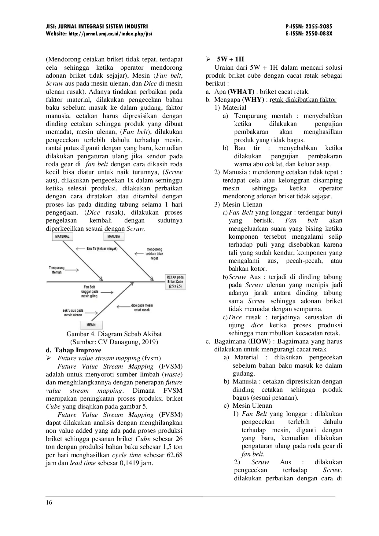 JISI: Jurnal Integrasi Sistem IndustriJISI: Jurnal Integrasi Sistem IndustriCV. Danagung adalah perusahaan manufaktur yang bergerak di pembuatan briket arang dengan bahan baku tempurung kelapa. Pada bulan Januari 2019 terdapat satu buyer pemesanan briket arang dengan jenis Cube (2,5 x 2,5) sebanyak 26 ton. Permasalahan yaitu produk cacat retak sebanyak 460 Kg (33.120 unit) dengan persentase cacat sebesar 2% serta terdapat pemborosan aktivitas produksi di penjemuran manual, dan adanya pengulangan aktivitas yang terjadi pada saat memasukan arang briket ke dalam karung. Berdasarkan hasil penelitian penyebab terjadinya cacat retak briket Cube adalah tempurung mentah, dan bau tir, cetakan tidak tepat dan terdapat cela sehingga tidak sejajar, fan belt yang longgar, scruw aus, dice di mesin ulenan rusak dan pemborosan aktivitas produksi di penjemuran manual dan pengulangan aktivitas. Usulan perbaikan cacat produk yakni melakukan pengecekan bahan baku, cetakan harus dipresisikan dengan dinding cetakan, fan belt dilakukan pengecekan, pergantian dan pengaturan ulang, scruw aus diratakan dengan proses las pada dinding tabung, dan dice di mesin ulenan dilakukan proses las dengan sudut menyesuaikan scruw. Usulan aktvitas yakni menghilangkan penjemuran manual serta menggabungkan stasiun timbangan dan packaging. Future value stream mapping dengan waktu siklus selama 62.68 jam dan lead time selama 0.1419 jam.