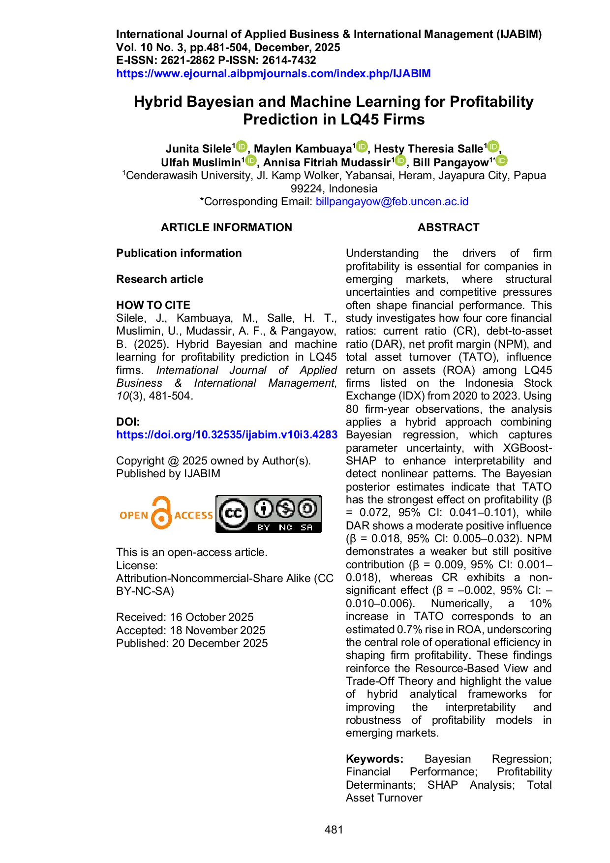 International Journal of Applied Business and International ManagementInternational Journal of Applied Business and International ManagementPemahaman tentang profitabilitas perusahaan sangat penting bagi perusahaan di pasar berkembang, di mana ketidakpastian struktural dan tekanan kompetitif sering menentukan kinerja keuangan. Penelitian ini mengkaji bagaimana empat rasio keuangan utama, yaitu current ratio (CR), debt‑to‑asset ratio (DAR), net profit margin (NPM), dan total asset turnover (TATO), mempengaruhi return on assets (ROA) pada perusahaan LQ45 Bursa Efek Indonesia (IDX) selama periode 2020‑2023. Dengan menggunakan 80 observasi firm‑year, analisis mengaplikasikan pendekatan hibrida yang menggabungkan regresi Bayesian untuk menangkap ketidakpastian parameter dan XGBoost‑SHAP untuk meningkatkan interpretabilitas serta mendeteksi pola non‑linier. Hasil posterior Bayesian menunjukkan bahwa TATO memiliki pengaruh paling kuat terhadap profitabilitas (β = 0,072, 95% CI: 0,041–0,101), sementara DAR memberikan pengaruh positif sedang (β = 0,018, 95% CI: 0,005–0,032). NPM memberikan kontribusi positif yang lebih lemah (β = 0,009, 95% CI: 0,001–0,018), dan CR tidak signifikan (β = –0,002, 95% CI: –0,010–0,006). Secara numerik, peningkatan 10% pada TATO diperkirakan meningkatkan ROA sebesar 0,7%, menegaskan peran sentral efisiensi operasional dalam membentuk profitabilitas perusahaan. Temuan ini memperkuat Resource‑Based View dan Trade‑Off Theory serta menyoroti nilai pendekatan hibrida dalam meningkatkan ketangguhan model profitabilitas di pasar berkembang.