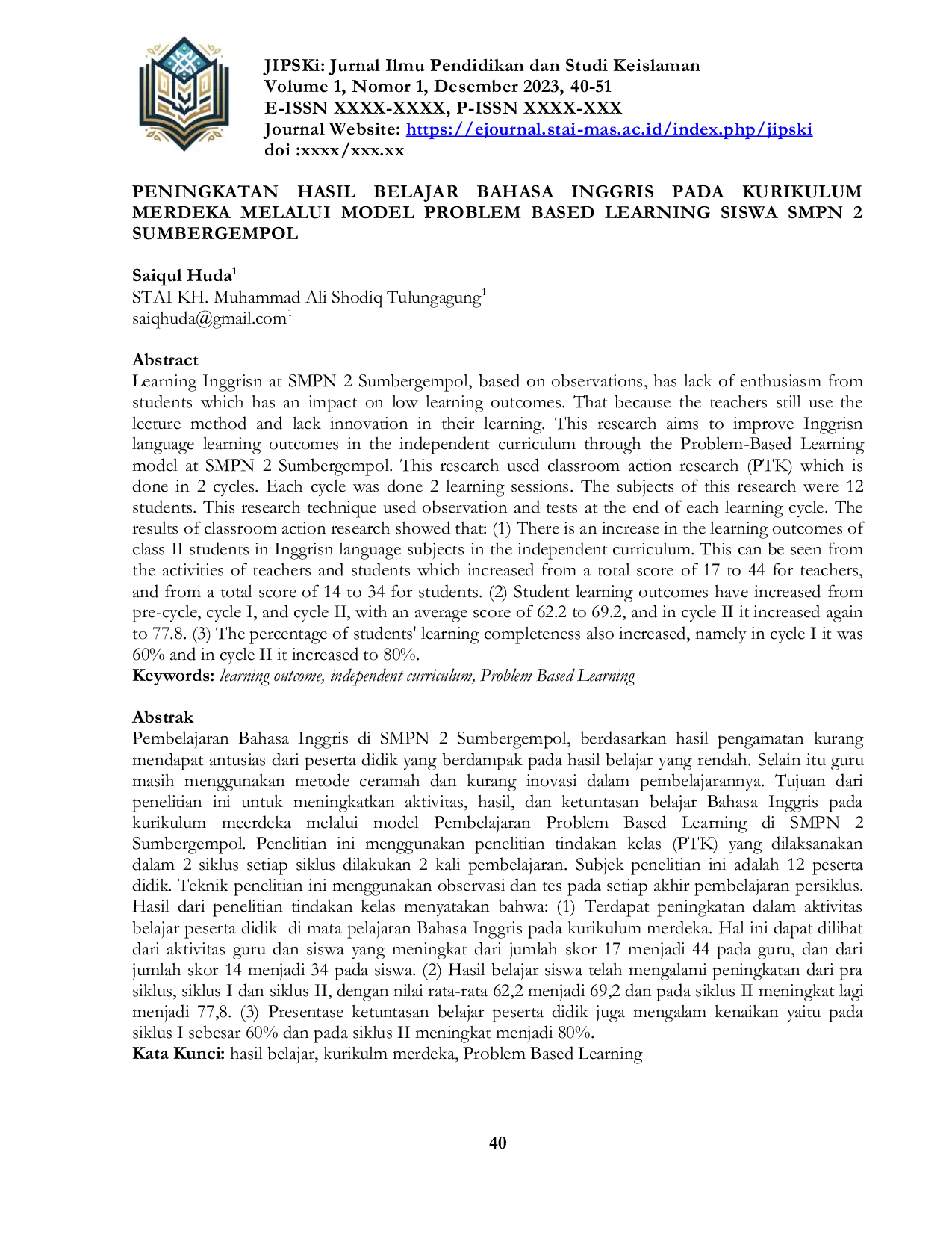JIPSKi: Jurnal Ilmu Pendidikan dan Studi KeislamanJIPSKi: Jurnal Ilmu Pendidikan dan Studi KeislamanPembelajaran Bahasa Inggris di SMPN 2 Sumbergempol, berdasarkan hasil pengamatan kurang mendapat antusias dari peserta didik yang berdampak pada hasil belajar yang rendah. Selain itu guru masih menggunakan metode ceramah dan kurang inovasi dalam pembelajarannya. Tujuan dari penelitian ini untuk meningkatkan aktivitas, hasil, dan ketuntasan belajar Bahasa Inggris pada kurikulum merdeka melalui model Pembelajaran Problem Based Learning di SMPN 2 Sumbergempol. Penelitian ini menggunakan penelitian tindakan kelas (PTK) yang dilaksanakan dalam 2 siklus setiap siklus dilakukan 2 kali pembelajaran. Subjek penelitian ini adalah 12 peserta didik. Teknik penelitian ini menggunakan observasi dan tes pada setiap akhir pembelajaran persiklus. Hasil dari penelitian tindakan kelas menyatakan bahwa: (1) Terdapat peningkatan dalam aktivitas belajar peserta didik di mata pelajaran Bahasa Inggris pada kurikulum merdeka. Hal ini dapat dilihat dari aktivitas guru dan siswa yang meningkat dari jumlah skor 17 menjadi 44 pada guru, dan dari jumlah skor 14 menjadi 34 pada siswa. (2) Hasil belajar siswa telah mengalami peningkatan dari pra siklus, siklus I dan siklus II, dengan nilai rata-rata 62,2 menjadi 69,2 dan pada siklus II meningkat lagi menjadi 77,8. (3) Presentase ketuntasan belajar peserta didik juga mengalam kenaikan yaitu pada siklus I sebesar 60% dan pada siklus II meningkat menjadi 80%.