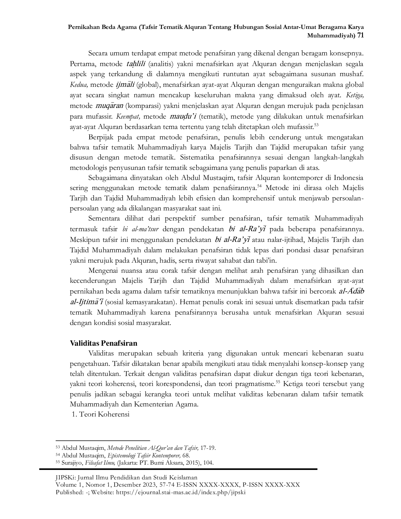 JIPSKi: Jurnal Ilmu Pendidikan dan Studi KeislamanJIPSKi: Jurnal Ilmu Pendidikan dan Studi KeislamanPernikahan beda agama tidak lagi menjadi isu baru dan sampai sekarang masih menarik untuk dikaji. Penelitian ini merupakan jenis penelitian kepustakaan. Sementara model penelitiannya berupa penelitian kualitatif dan menggunakan metode analisis-komparatif untuk analisis data. Setelah melakukan analisis diperoleh kesimpulan bahwa sumber penafsiran yang digunakan oleh Muhammadiyah ketika menafsirkan ayat-ayat tentang pernikahan beda agama meliputi: Alquran, hadis, riwayat sahabat serta tabiin, akal (nalar-ijtihad), kitab-kitab tafsir terdahulu, dan kitab fiqh. Metode penafsiran yang digunakan oleh Muhammadiyah adalah metode tematik dengan corak al‑adab al‑ijtimai (sosial‑kemasyarakatan). Sementara validitas penafsiran terhadap ayat‑ayat pernikahan beda agama setelah diuji dengan tiga teori kebenaran maka diperoleh hasil: 1) Menurut teori koherensi penafsiran Muhammadiyah dianggap tidak benar karena tidak konsisten dalam menyampaikan proposisi‑proposisi melalui logika pemikirannya serta tidak konsisten antara pendekatan kontekstual yang digunakan dalam penafsiran yang dijelaskan pada “Kata Pengantar dengan praktik penafsirannya. 2) Berdasarkan teori korespondensi Muhammadiyah dianggap kurang dalam mengaplikasikan teori tersebut. 3) Sementara menurut teori pragmatisme penafsiran Muhammadiyah dianggap tidak benar karena tidak dapat memberikan jawaban atas persoalan yang dihadapi oleh masyarakat Indonesia saat ini.