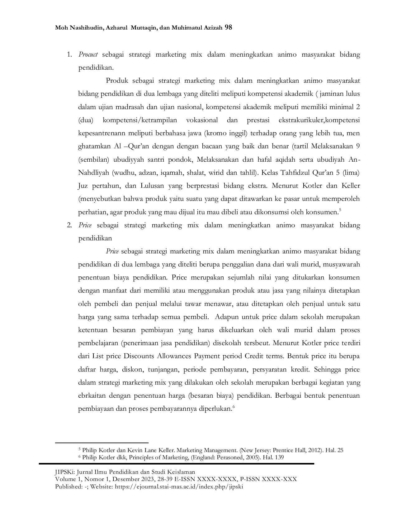JIPSKi: Jurnal Ilmu Pendidikan dan Studi KeislamanJIPSKi: Jurnal Ilmu Pendidikan dan Studi KeislamanPenelitian ini bertujuan untuk menganalisis dan mendeskripsikan secara mendalam 1) Product dalam meningkatkan animo masyarakat bidang pendidikan SMP Mambaus Sholihin Blitar. 2) Price dalam meningkatkan animo masyarakat bidang pendidikan di SMP Mambaus Sholihin Blitar. 3) Place dalam meningkatkan animo masyarakat bidang pendidikan di SMP Mambaus Sholihin Blitar. 4) Promotion dalam meningkatkan animo masyarakat bidang pendidikan di SMP Mambaus Sholihin Blitar. Penelitian ini menggunakan pendekatan kualitatif, jenis studi kasus dengan rancangan multikasus. Teknik pengumpulan data menggunakan wawancara mendalam, observasi partisipan dan dokumentasi. Analisis data mulai dari kondsasi data, penyajian data, verifikasi dan penarikan kesimpulan. Data dianalisis dari data kasus tunggal dan lintas kasus. Hasil penelitian menunjukkan 1) Product sebagai strategi marketing mix dalam meningkatkan animo masyarakat bidang pendidikan meliputi kompetensi akademik (jaminan lulus ujian madrasah dan ujian nasional), dan kompetensi kepesantrenan. 2) Price sebagai strategi marketing mix dalam meningkatkan animo masyarakat bidang meliputi pembiayaan yang terjangkau, subsidi silang dan beasiswa. 3) Place sebagai strategi marketing mix dalam meningkatkan animo masyarakat bidang pendidikan meliputi lokasi madrasah di dalam pesantren. 4) Promotion sebagai strategi marketing mix dalam meningkatkan animo masyarakat bidang pendidikan meliputi promosi secara langsung dari wali santri dan santri, media cetak elektronik dan medsos. 5) Performance lembaga sebagai strategi marketing mix dalam meningkatkan animo masyarakat bidang pendidikan adalah lembaga terakreditasi A, bangunan megah dan fasilitas lengkap, kinerja layanan administrasi keuangan yang ramah, akuntabel, dan cepat, kinerja layanan makan dan minum tepat waktu, bergizi, sehat, variatif, dan cukup, kinerja layanan MCK yang bersih dan mencukupi, kinerja layanan keamanan dan kenyamanan, guru dan pembimbing adalah orang tua siswa. 6) Pray sebagai strategi marketing mix dalam meningkatkan animo masyarakat bidang pendidikan adalah istighosah, aurotan lainnya dan guru spiritual.