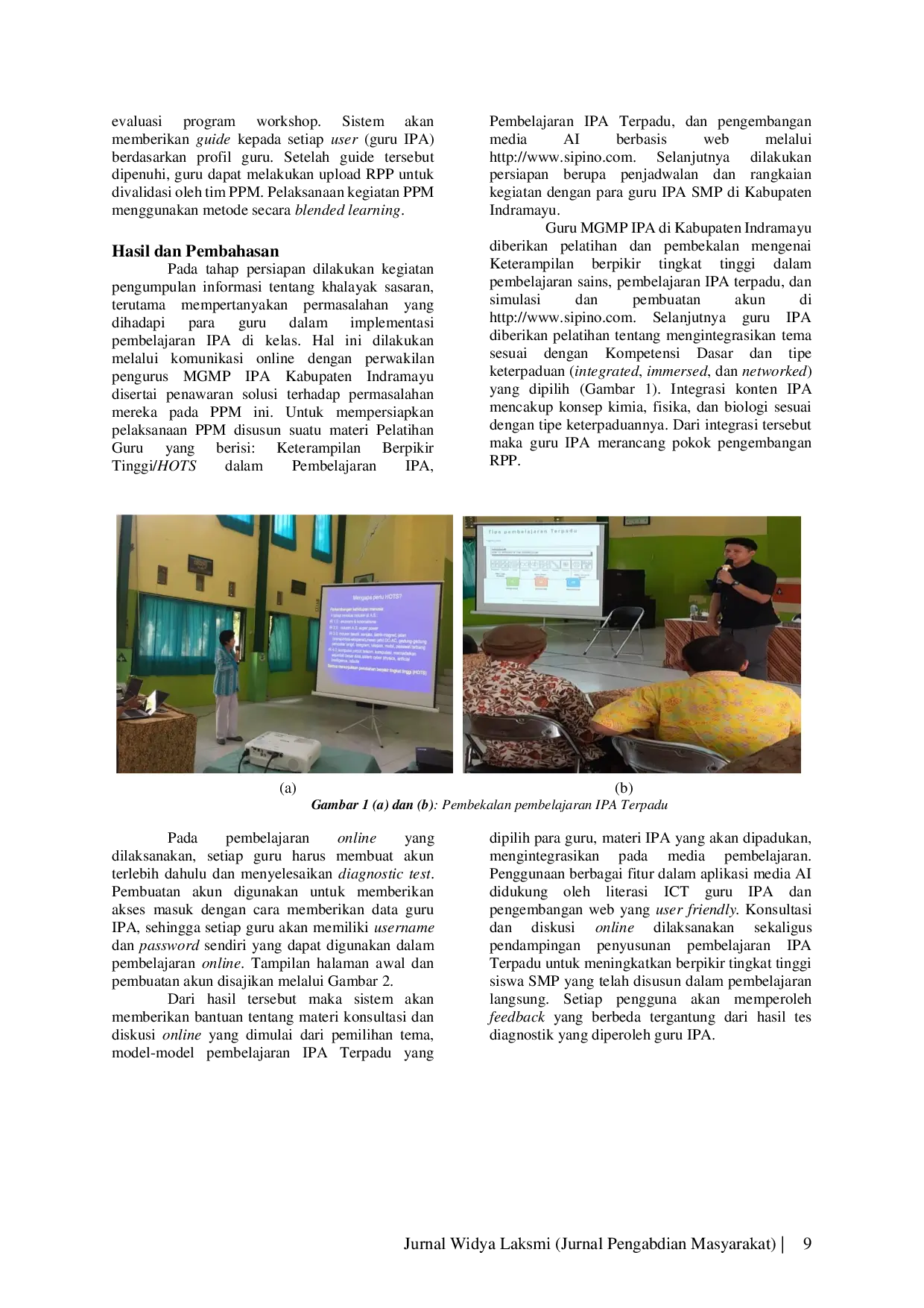 Jurnal Widya Laksmi: Jurnal Pengabdian Kepada MasyarakatJurnal Widya Laksmi: Jurnal Pengabdian Kepada MasyarakatPerkembangan revolusi industri 4.0 mendorong manusia untuk berpikir tingkat tinggi dalam kehidupan. Implikasinya terjadi berupa pengembangan kemampuan komputeasi berbasis big data dan melibatkan machine learning. Bidang pendidikan menjadi salah satu sektor yang mengalami perubahan besar dengan adanya Internet of Things (IoT) dan Artificial Intelligence yang salah satunya berupa Intelligent Tutoring System (ITS). Tujuan dari PPM ini adalah menggunakan ITS untuk membantu guru dalam mengembangkan pembelajaran IPA terpadu. Sebanyak 18 dari 60 orang guru IPA di Kabupaten Indramayu mengikuti program peningkatan kompetensi guru IPA dalam bidang mendesain pembelajaran IPA terpadu. Metode Deskriptif kualitatif digunakan untuk menganalisis respon guru IPA terhadap proses pelaksanaan PPM ini yang dilaksanakan melalui tahap persiapan, tahap pelaksanaan, tahap evaluasi, tahap analisis dan tahap pelaporan. Hasil yang diperoleh dalam pelaksanaan PPM ini adalah respon guru yang baik dalam mengembangkan pembelajaran IPA terpadu berbantuan ITS. Beberapa respon guru ini dijadikan untuk pengembangan aplikasi ITS dan penyempurnaan program PPM selanjutnya.