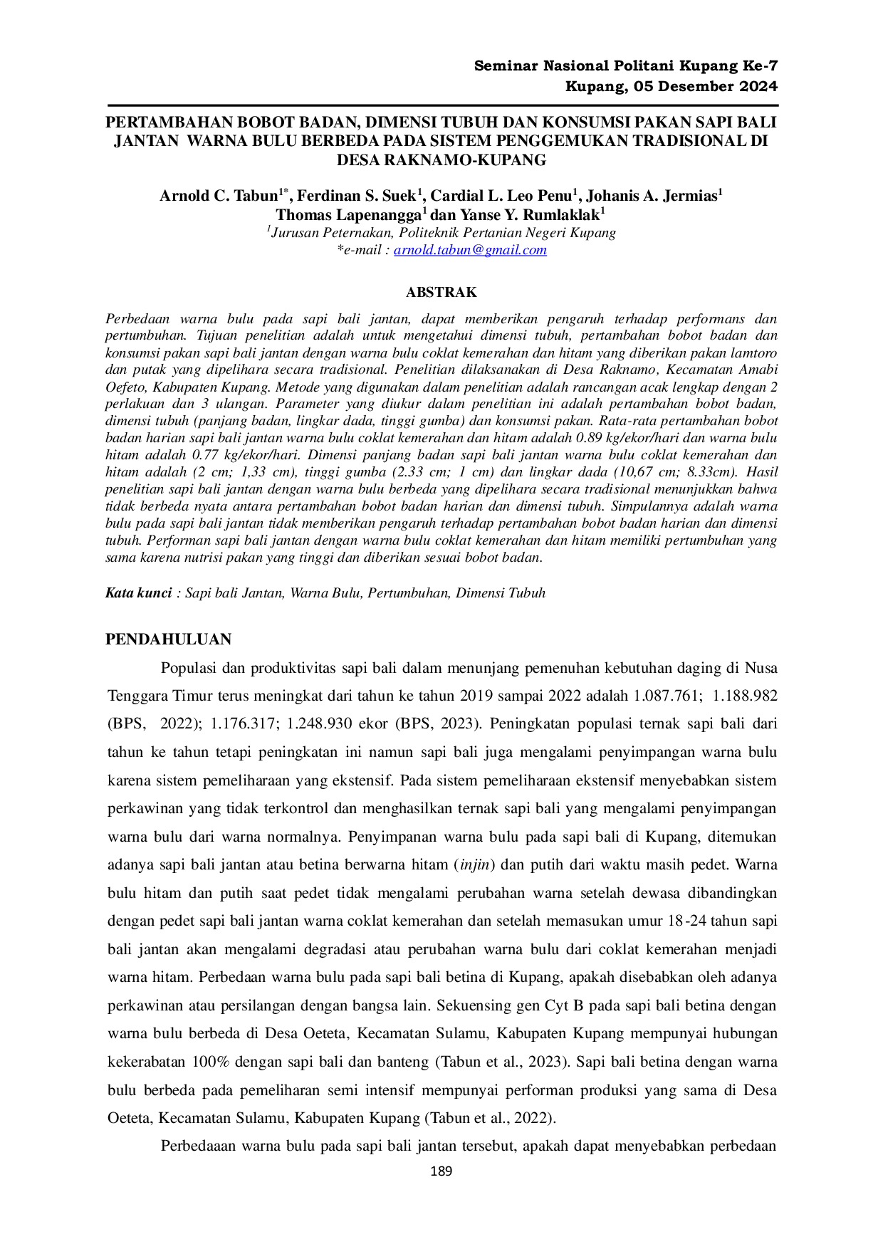 PSNP : Prosiding Seminar Nasional PenelitianPSNP : Prosiding Seminar Nasional PenelitianPerbedaan warna bulu pada sapi bali jantan dapat memberikan pengaruh terhadap performans dan pertumbuhan. Tujuan penelitian adalah untuk mengetahui dimensi tubuh, pertambahan bobot badan dan konsumsi pakan sapi bali jantan dengan warna bulu coklat kemerahan dan hitam yang diberikan pakan lamtoro dan putak yang dipelihara secara tradisional. Penelitian dilaksanakan di Desa Raknamo, Kecamatan Amabi Oefeto, Kabupaten Kupang. Metode yang digunakan dalam penelitian adalah rancangan acak lengkap dengan 2 perlakuan dan 3 ulangan. Parameter yang diukur dalam penelitian ini adalah pertambahan bobot badan, dimensi tubuh (panjang badan, lingkar dada, tinggi gumba) dan konsumsi pakan. Rata-rata pertambahan bobot badan harian sapi bali jantan warna bulu coklat kemerahan dan hitam adalah 0.89 kg/ekor/hari dan warna bulu hitam adalah 0.77 kg/ekor/hari. Dimensi panjang badan sapi bali jantan warna bulu coklat kemerahan dan hitam adalah (2 cm; 1,33 cm), tinggi gumba (2.33 cm; 1 cm) dan lingkar dada (10,67 cm; 8.33cm). Hasil penelitian sapi bali jantan dengan warna bulu berbeda yang dipelihara secara tradisional menunjukkan bahwa tidak berbeda nyata antara pertambahan bobot badan harian dan dimensi tubuh. Simpulannya adalah warna bulu pada sapi bali jantan tidak memberikan pengaruh terhadap pertambahan bobot badan harian dan dimensi tubuh. Performan sapi bali jantan dengan warna bulu coklat kemerahan dan hitam memiliki pertumbuhan yang sama karena nutrisi pakan yang tinggi dan diberikan sesuai bobot badan.