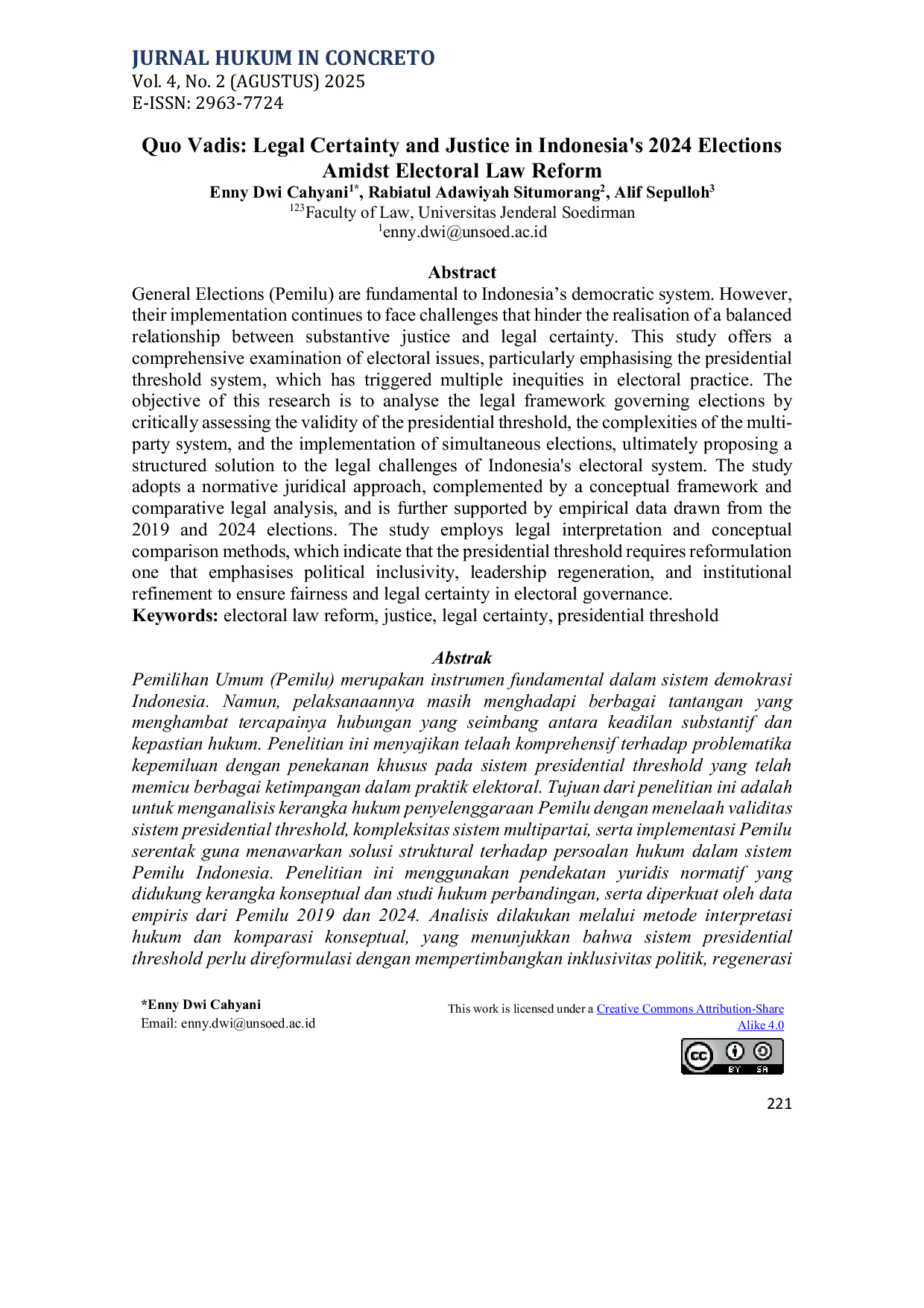 Jurnal Hukum In ConcretoJurnal Hukum In ConcretoPemilihan Umum (Pemilu) merupakan instrumen fundamental dalam sistem demokrasi Indonesia. Namun, pelaksanaannya masih menghadapi berbagai tantangan yang menghambat tercapainya hubungan yang seimbang antara keadilan substantif dan kepastian hukum. Penelitian ini menyajikan telaah komprehensif terhadap problematika kepemiluan dengan penekanan khusus pada sistem presidential threshold yang telah memicu berbagai ketimpangan dalam praktik elektoral. Tujuan dari penelitian ini adalah untuk menganalisis kerangka hukum penyelenggaraan Pemilu dengan menelaah validitas sistem presidential threshold, kompleksitas sistem multipartai, serta implementasi Pemilu serentak guna menawarkan solusi struktural terhadap persoalan hukum dalam sistem Pemilu Indonesia. Penelitian ini menggunakan pendekatan yuridis normatif yang didukung kerangka konseptual dan studi hukum perbandingan, serta diperkuat oleh data empiris dari Pemilu 2019 dan 2024. Analisis dilakukan melalui metode interpretasi hukum dan komparasi konseptual, yang menunjukkan bahwa sistem presidential threshold perlu direformulasi dengan mempertimbangkan inklusivitas politik, regenerasi kepemimpinan, dan penguatan kelembagaan demi mewujudkan keadilan dan kepastian hukum dalam tata kelola Pemilu.