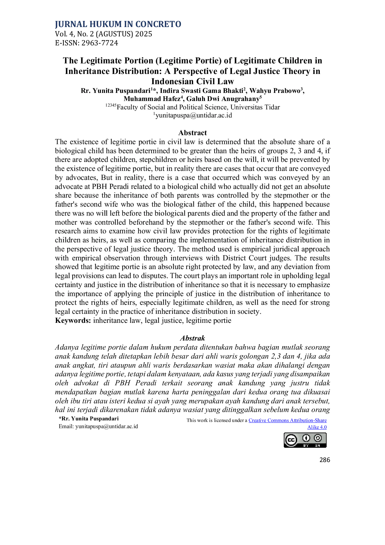 Jurnal Hukum In ConcretoJurnal Hukum In ConcretoAdanya legitime portie dalam hukum perdata ditentukan bahwa bagian mutlak seorang anak kandung telah ditetapkan lebih besar dari ahli waris golongan 2,3 dan 4, jika ada anak angkat, tiri ataupun ahli waris berdasarkan wasiat maka akan dihalangi dengan adanya legitime portie, tetapi dalam kenyataan, ada kasus yang terjadi yang disampaikan oleh advokat di PBH Peradi terkait seorang anak kandung yang justru tidak mendapatkan bagian mutlak karena harta peninggalan dari kedua orang tua dikuasai oleh ibu tiri atau isteri kedua si ayah yang merupakan ayah kandung dari anak tersebut, hal ini terjadi dikarenakan tidak adanya wasiat yang ditinggalkan sebelum kedua orang tua kandung meninggal dan harta ayah dan ibu dikuasai sebelumnya oleh ibu tiri atau isteri kedua ayah. Penelitian ini bertujuan untuk mengkaji bagaimana hukum perdata memberikan perlindungan terhadap hak anak sah sebagai ahli waris, serta membandingkan pelaksanaan pembagian waris dalam perspektif teori keadilan hukum. Metode yang digunakan adalah pendekatan yuridis empiris dengan observasi empiris melalui wawancara dengan hakim Pengadilan Negeri. Hasil penelitian menunjukkan bahwa legitime portie merupakan hak mutlak yang dilindungi oleh hukum, dan setiap penyimpangan dari ketentuan hukum dapat menimbulkan sengketa. Pengadilan berperan penting dalam menegakkan kepastian hukum dan keadilan dalam pembagian warisan sehingga perlu ditekankan pentingnya penerapan prinsip keadilan dalam pembagian harta warisan untuk melindungi hak-hak ahli waris, terutama anak sah, serta perlunya kepastian hukum yang kuat dalam praktik pembagian warisan di masyarakat.