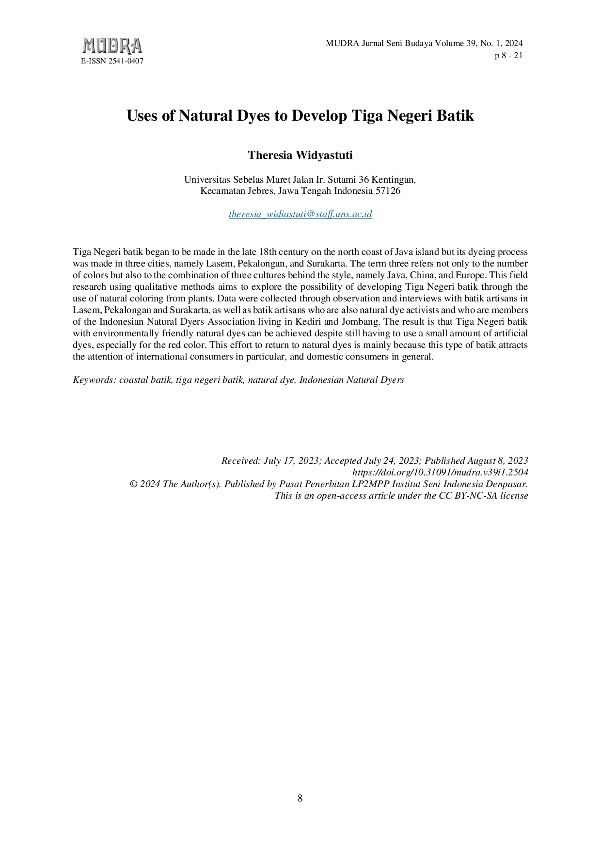 Mudra Jurnal Seni BudayaMudra Jurnal Seni BudayaPenelitian ini bertujuan untuk mengeksplorasi kemungkinan pengembangan batik Tiga Negeri melalui penggunaan pewarna alami dari tanaman. Metode penelitian menggunakan pendekatan kualitatif dengan observasi dan wawancara terhadap pengrajin batik di Lasem, Pekalongan, dan Surakarta, serta aktivis pewarna alami di Kediri dan Jombang. Hasil menunjukkan bahwa batik Tiga Negeri dengan pewarna alami ramah lingkungan dapat dicapai meskipun masih memerlukan sedikit pewarna sintetik, terutama untuk warna merah. Upaya kembali ke pewarna alami dilakukan karena menarik perhatian konsumen internasional dan domestik.