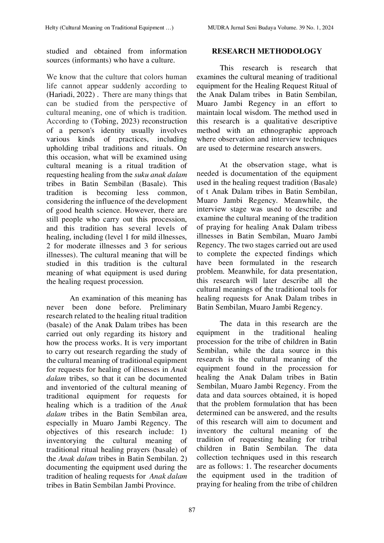 Mudra Jurnal Seni BudayaMudra Jurnal Seni BudayaPenelitian ini bertujuan untuk menginventarisir makna budaya dari peralatan ritual tradisional dan mendokumentasikan peralatan yang digunakan selama tradisi permintaan penyembuhan suku Anak Dalam Batin Sembilan Kabupaten Muaro Jambi sebagai bentuk upaya untuk mempertahankan kearifan lokal. Metode penelitian yang digunakan adalah metode deskriptif kualitatif dengan pendekatan etnografi. Teknik pengumpulan data menggunakan wawancara dan dokumentasi, sedangkan teknik analisis data menggunakan teknik reduksi data, penyajian data, dan kesimpulan. Hasil penelitian menunjukkan berbagai deskripsi dan dokumentasi mengenai makna budaya peralatan yang digunakan dalam tradisi permintaan penyembuhan suku Anak Dalam di Batin Sembilan Kabupaten Muaro Jambi sebagai bentuk upaya untuk mempertahankan kearifan lokal. Nama peralatan yang digunakan dalam tradisi ini antara lain: Balai, sesaji, Balai Pengadap, Ancak Kembang, Dupo dan orang-orangan yang merupakan peralatan besar yang umum digunakan, sementara peralatan lain yang digunakan meliputi: Bertih, Cace, Balai di atas balai, cengkraman, redap, bedak kramasan, nampan sirih tambang balai, kain andam, gambar koneng, dan cawan.