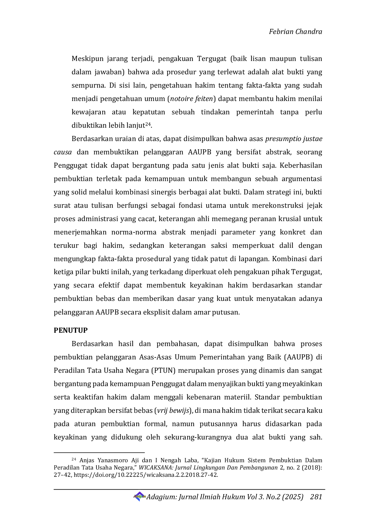 Adagium: Jurnal Ilmiah HukumAdagium: Jurnal Ilmiah HukumPenelitian ini bertujuan untuk menganalisis standar pembuktian dan efektivitas alat bukti dalam sengketa tata usaha negara yang didasarkan pada pelanggaran Asas-Asas Umum Pemerintahan yang Baik (AAUPB). Fokus utama penelitian adalah menjawab pertanyaan bagaimana pelanggaran terhadap asas yang bersifat abstrak dapat dibuktikan secara konkret di persidangan Peradilan Tata Usaha Negara (PTUN), sebuah area yang penuh tantangan praktis bagi para pencari keadilan. Metode penelitian yang digunakan adalah yuridis normatif dengan pendekatan perundang-undangan, pendekatan kasus, dan pendekatan konseptual. Bahan hukum primer dan sekunder dianalisis secara kualitatif untuk mengidentifikasi praktik pembuktian dalam yurisprudensi. Hasil penelitian menunjukkan bahwa standar pembuktian pelanggaran AAUPB bersifat bebas (vrij bewijs), bergantung pada keyakinan hakim yang didukung oleh minimal dua alat bukti yang sah. Pembuktian yang efektif tidak dapat bertumpu pada satu jenis bukti, melainkan pada kombinasi sinergis antara bukti surat untuk menelusuri proses, keterangan ahli untuk menerjemahkan norma abstrak, dan keterangan saksi untuk mengungkap fakta prosedural. Dampak dari penelitian ini adalah memberikan kerangka kerja strategis bagi praktisi hukum dalam menyusun gugatan dan menawarkan basis bagi pengembangan pedoman peradilan demi meningkatkan konsistensi putusan.