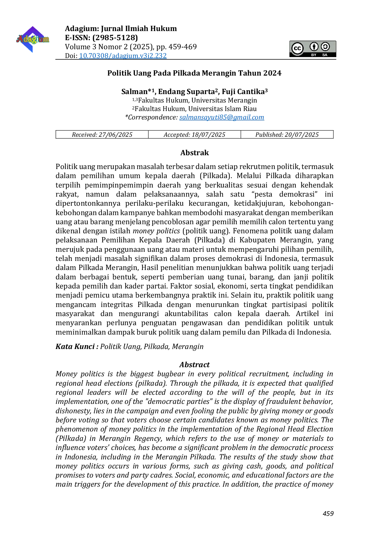 Adagium: Jurnal Ilmiah HukumAdagium: Jurnal Ilmiah HukumPolitik uang merupakan masalah terbesar dalam setiap rekrutmen politik, termasuk dalam pemilihan umum kepala daerah (Pilkada). Melalui Pilkada diharapkan terpilih pemimpin daerah yang berkualitas sesuai kehendak rakyat, namun dalam pelaksanaannya, salah satu “pesta demokrasi ini dipertontonkannya perilaku-perilaku kecurangan, ketidakjujuran, kebohongan‑kebohongan dalam kampanye bahkan membodohi masyarakat dengan memberikan uang atau barang menjelang pencoblosan agar pemilih memilih calon tertentu yang dikenal dengan istilah money politics (politik uang). Fenomena politik uang dalam pelaksanaan Pemilihan Kepala Daerah (Pilkada) di Kabupaten Merangin, yang merujuk pada penggunaan uang atau materi untuk mempengaruhi pilihan pemilih, telah menjadi masalah signifikan dalam proses demokrasi di Indonesia, termasuk dalam Pilkada Merangin, Hasil penelitian menunjukkan bahwa politik uang terjadi dalam berbagai bentuk, seperti pemberian uang tunai, barang, dan janji politik kepada pemilih dan kader partai. Faktor sosial, ekonomi, serta tingkat pendidikan menjadi pemicu utama berkembangnya praktik ini. Selain itu, praktik politik uang mengancam integritas Pilkada dengan menurunkan tingkat partisipasi politik masyarakat dan mengurangi akuntabilitas calon kepala daerah. Artikel ini menyarankan perlunya penguatan pengawasan dan pendidikan politik untuk meminimalkan dampak buruk politik uang dalam pemilu dan Pilkada di Indonesia.