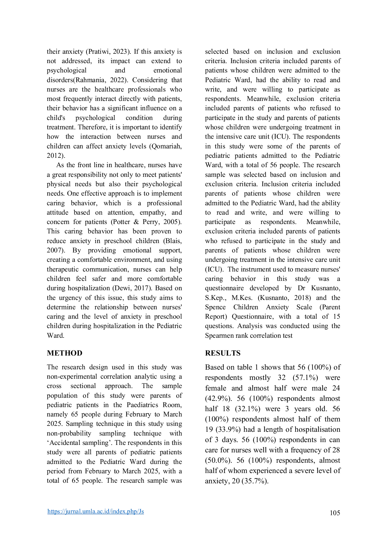 - The Relationship Between Nurse Caring and Anxiety Levels in Preschool Children During Hospitalization... doi.org/10.38040/js.v17i2.1246The Relationship Between Nurse Caring and Anxiety Levels in Preschool Children During Hospitalization doi 10 38040 js v17i2 1246