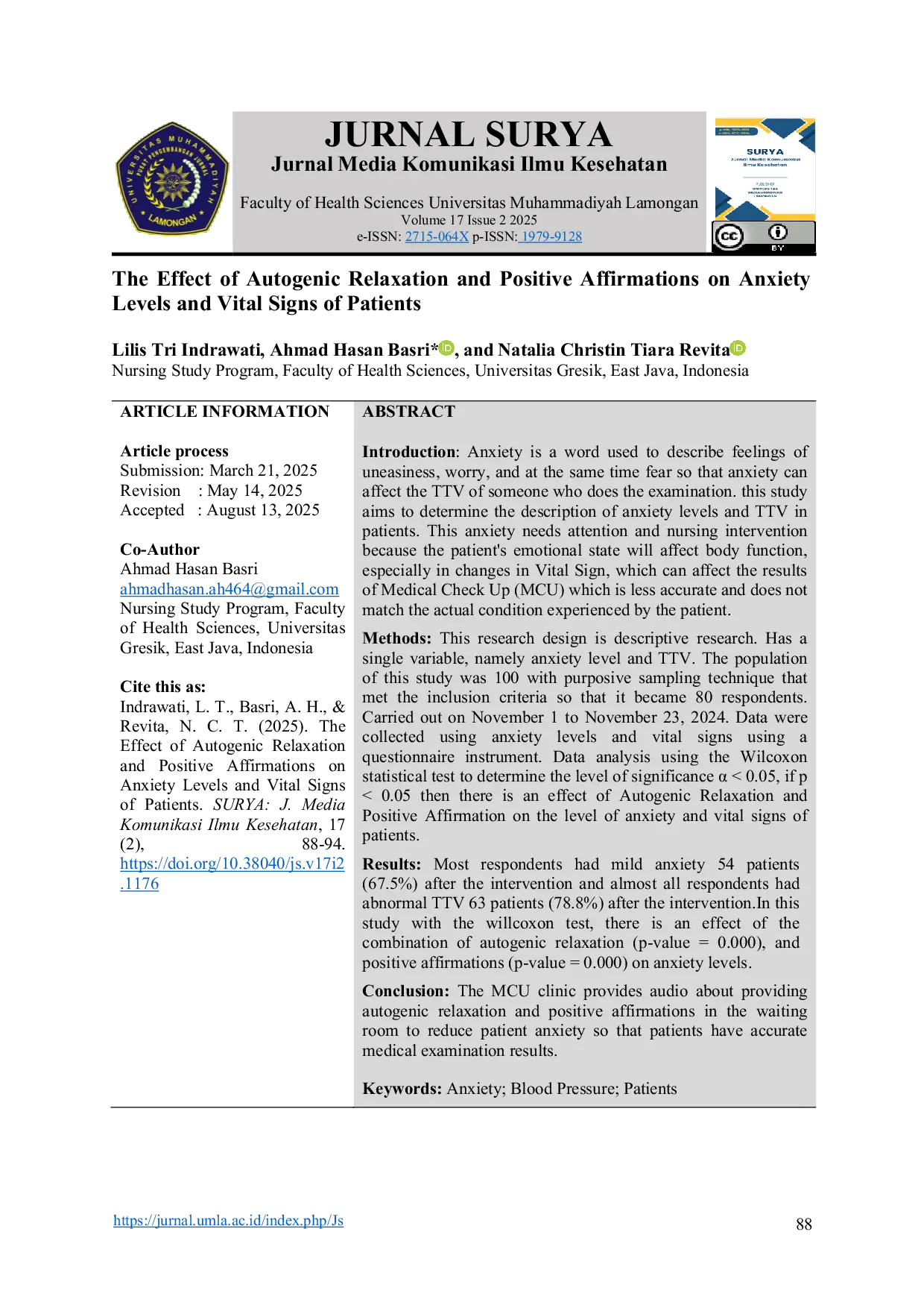 - The Effect of Autogenic Relaxation and Positive Affirmations on Anxiety Levels and Vital Signs of Patients... jurnal.umla.ac.id/index.php/Js/article/view/1176The Effect of Autogenic Relaxation and Positive Affirmations on Anxiety Levels and Vital Signs of Patients jurnal umla ac index php Js article view 1176