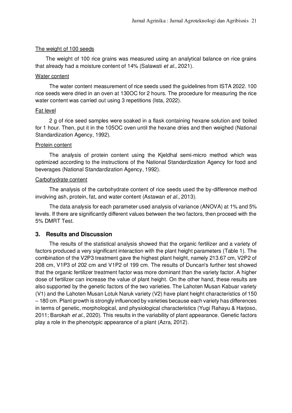 Penggunaan dosis pupuk organik pada varietas yang diperkenalkan memiliki pengaruh signifikan pada parameter tinggi tanaman, klorofil, protein, lemak, dan amilosa.Faktor pupuk organik lebih dominan daripada faktor varietas pada parameter yang menunjukkan interaksi.Tidak terdapat interaksi antara faktor pupuk organik dan jenis varietas pada parameter jumlah tiller, jumlah malai per tanaman, jumlah biji per malai, dan berat 100 biji.