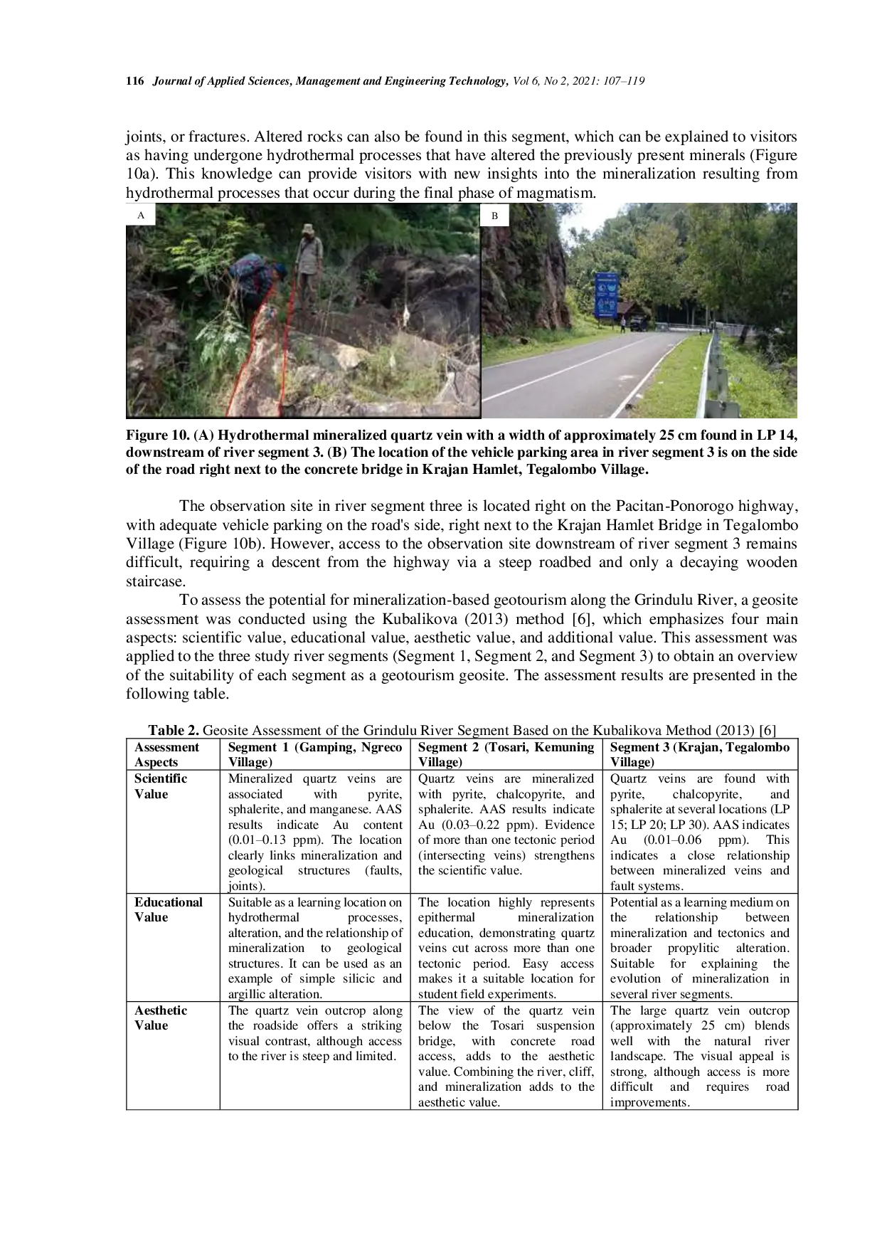 Journal of Applied Sciences, Management and Engineering TechnologyJournal of Applied Sciences, Management and Engineering TechnologyGrindulu River di Pacitan merupakan salah satu daerah yang menunjukkan manifestasi alterasi hidrotermal dan mineralisasi logam. Namun, logam berharga yang ditemukan relatif rendah, sehingga tidak ekonomis untuk dieksploitasi. Kondisi ini membuka peluang lain dengan memanfaatkan wilayah tersebut sebagai laboratorium alami untuk pendidikan geologi dan pengembangan geowisata berkelanjutan. Penelitian ini mengevaluasi potensi geowisata berbasis mineralisasi hidrotermal melalui penilaian geosite. Area penelitian mencakup Formasi Watupatok dan Formasi Arjosari, yang menunjukkan zona alterasi silikik, argilik, dan propilitik. Metode penelitian meliputi pemetaan geologi, pengambilan sampel batuan, analisis petrografi, XRD, FA-AAS, dan penilaian geosite menggunakan metode Kubalikova, yang mencakup aspek ilmiah, edukatif, estetika, dan nilai tambah. Hasil menunjukkan keberadaan mineralisasi berupa pirit, kalkopirit, sfalerit, dan galena, dengan kadar logam berharga (Au, Ag, Cu, Pb, Zn) yang rendah. Meskipun demikian, ketiga segmen Grindulu River memiliki nilai geosite signifikan untuk tujuan pendidikan dan konservasi, dengan segmen 2 dianggap paling ideal karena aksesibilitas dan nilai edukatifnya yang lebih baik. Penelitian ini menyimpulkan bahwa Grindulu River lebih tepat dikembangkan sebagai destinasi geowisata berkelanjutan berbasis konservasi dan pendidikan geologi daripada eksploitasi pertambangan.