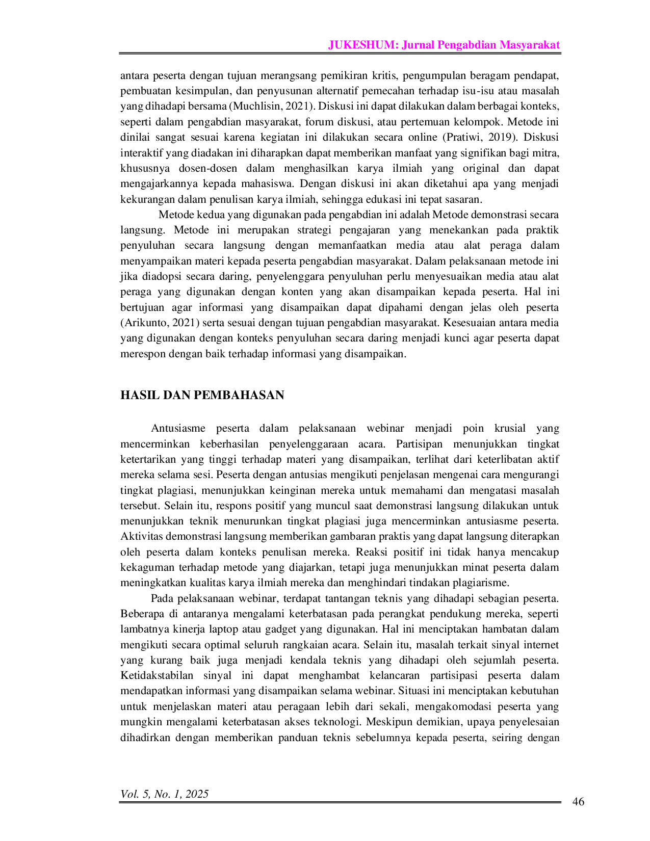Jukeshum: Jurnal Pengabdian MasyarakatJukeshum: Jurnal Pengabdian MasyarakatMasih tingginya angka plagiasi dalam pembuatan artikel ilmiah dan banyaknya praktik copy paste mendasari kegiatan ini dilakukan. Kegiatan ini bertujuan untuk memberikan solusi terhadap masalah plagiat yang sering terjadi akibat praktik tersebut, dan juga kegiatan ini menyediakan wawasan dan keterampilan bagi peserta dalam menghindari tindakan plagiarisme. Metode yang digunakan adalah diskusi interaktif dan demonstrasi langsung melalui online menggunakan aplikasi zoom dan dikemas dalam bentuk webinar. Pengabdian Masyarakat ini diikuti oleh 33 orang peserta yang terdiri dari dosen dan mahasiswa tingkat akhir universitas Tjut Nyak Dhien. Temuan dalam kegiatan ini berupa peningkatan pemahaman peserta terhadap praktik parafrase dan dampak negatif plagiat. Selain itu, peserta juga memperoleh keterampilan praktis dalam menerapkan teknik parafrase secara efektif dengan hasil berupa pemahaman yang lebih baik tentang pentingnya menciptakan konten orisinal dan bagaimana menghindari tindakan plagiat. Kesimpulan webinar ini memberikan pandangan menyeluruh tentang pentingnya pencegahan plagiat dan meningkatkan kesadaran akan konsekuensi hukum dan akademis yang mungkin timbul akibat tindakan tersebut.