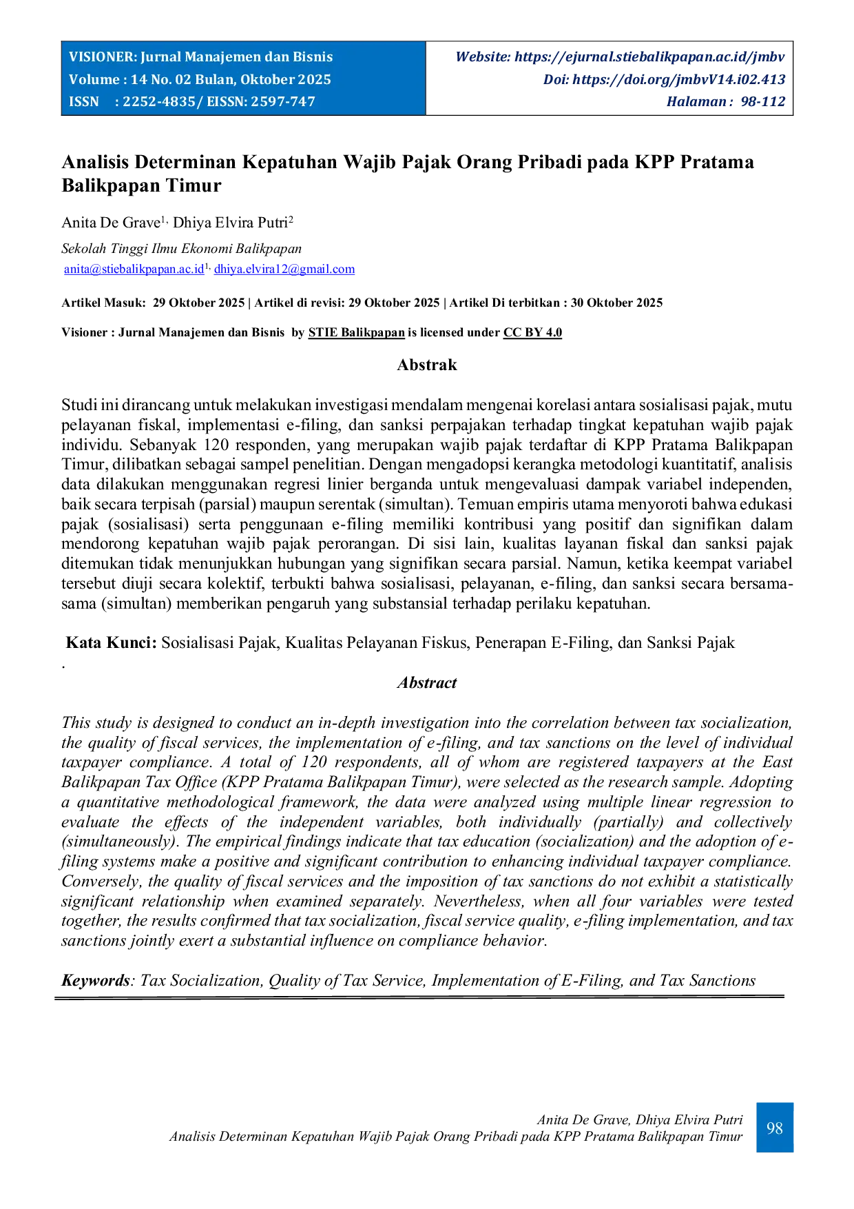 Visioner : Jurnal Manajemen dan BisnisVisioner : Jurnal Manajemen dan BisnisStudi ini dirancang untuk melakukan investigasi mendalam mengenai korelasi antara sosialisasi pajak, mutu pelayanan fiskal, implementasi e-filing, dan sanksi perpajakan terhadap tingkat kepatuhan wajib pajak individu. Sebanyak 120 responden, yang merupakan wajib pajak terdaftar di KPP Pratama Balikpapan Timur, dilibatkan sebagai sampel penelitian. Dengan mengadopsi kerangka metodologi kuantitatif, analisis data dilakukan menggunakan regresi linier berganda untuk mengevaluasi dampak variabel independen, baik secara terpisah (parsial) maupun serentak (simultan). Temuan empiris utama menyoroti bahwa edukasi pajak (sosialisasi) serta penggunaan e-filing memiliki kontribusi yang positif dan signifikan dalam mendorong kepatuhan wajib pajak perorangan. Di sisi lain, kualitas layanan fiskal dan sanksi pajak ditemukan tidak menunjukkan hubungan yang signifikan secara parsial. Namun, ketika keempat variabel tersebut diuji secara kolektif, terbukti bahwa sosialisasi, pelayanan, e-filing, dan sanksi secara bersama-sama (simultan) memberikan pengaruh yang substansial terhadap perilaku kepatuhan.