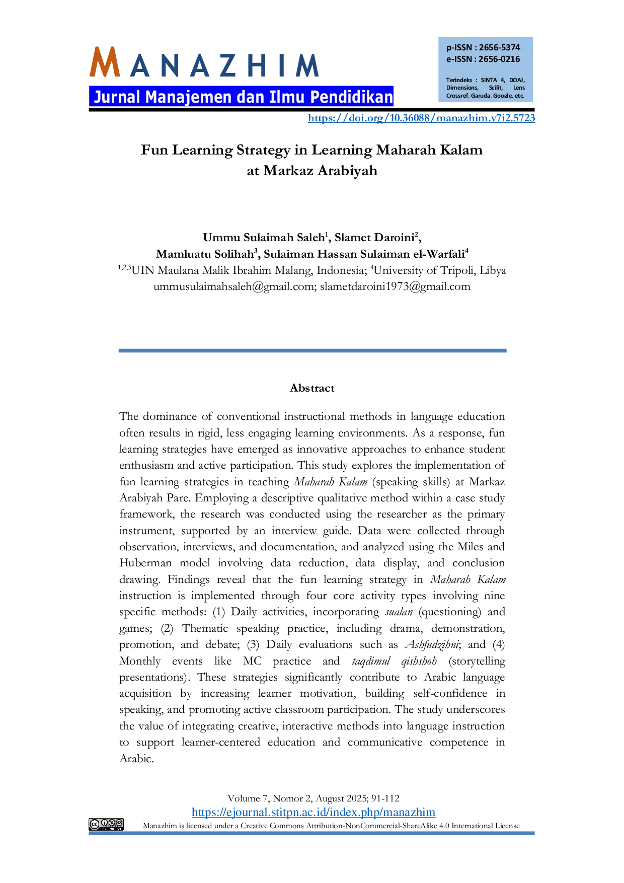 - Fun Learning Strategy in Learning Maharah Kalam at Markaz Arabiyah | MANAZHIM. fun learning strategy... ejournal.stitpn.ac.id/index.php/manazhim/article/view/5723Fun Learning Strategy in Learning Maharah Kalam at Markaz Arabiyah MANAZHIM fun learning strategy ejournal stitpn ac index php manazhim article view 5723