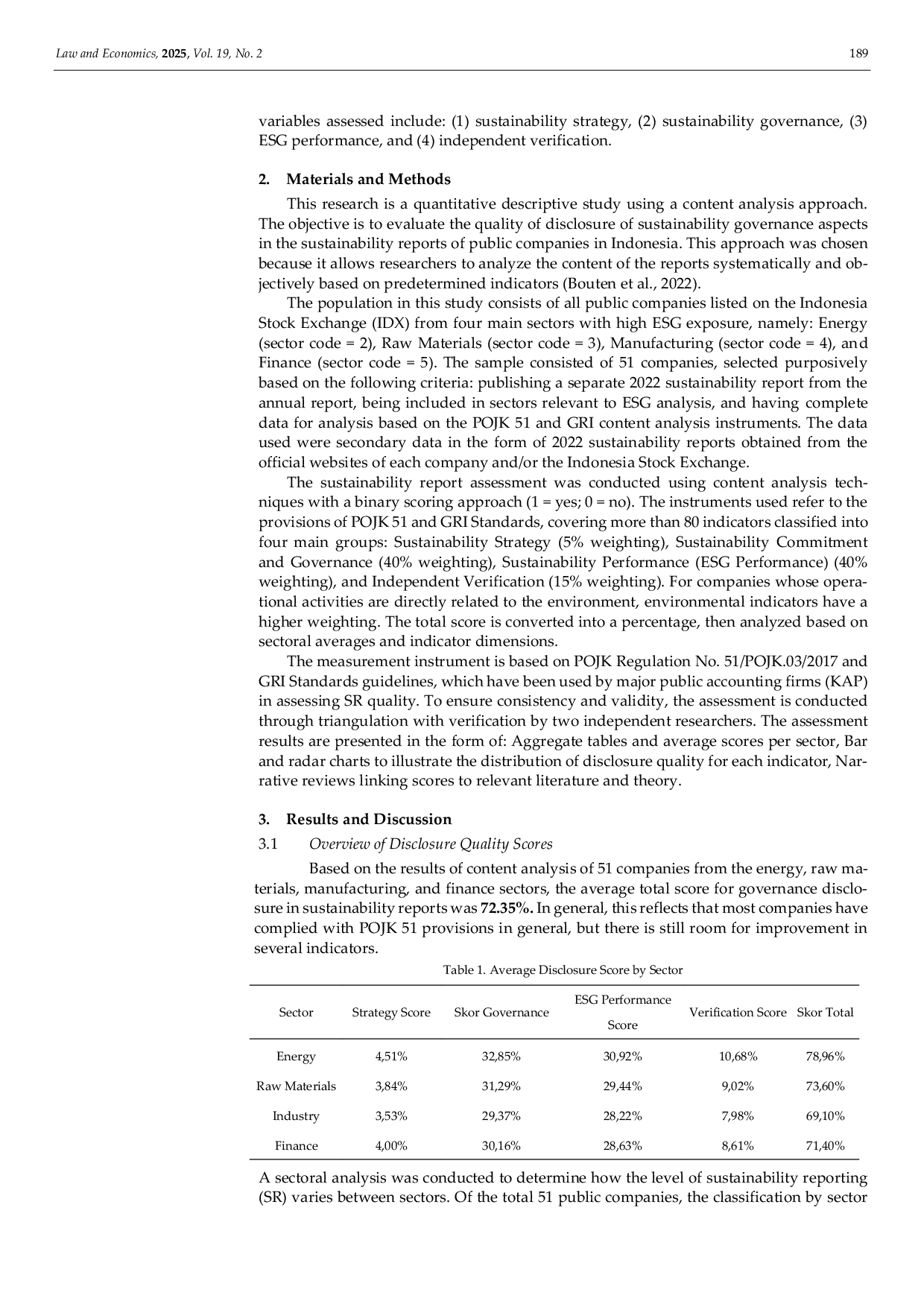 Law and EconomicsLaw and EconomicsLaporan keberlanjutan (SR) merupakan alat penting untuk menunjukkan transparansi dan tanggung jawab perusahaan terhadap isu lingkungan, sosial, dan tata kelola (ESG). Studi ini mengevaluasi kualitas pengungkapan keberlanjutan dalam empat dimensi utama: strategi keberlanjutan, tata kelola keberlanjutan, kinerja keberlanjutan, dan verifikasi independen. Evaluasi dilakukan terhadap 51 perusahaan publik Indonesia di sektor energi, bahan baku, manufaktur, dan keuangan menggunakan lebih dari 40 indikator yang dikembangkan dari ketentuan POJK 51/2017. Hasil analisis menunjukkan bahwa sektor energi secara konsisten mencapai skor tertinggi di semua dimensi, sedangkan sektor keuangan dan industri tertinggal, terutama dalam dimensi strategi dan verifikasi. Hanya 31% perusahaan yang menyertakan pernyataan jaminan independen. Temuan ini menunjukkan kebutuhan untuk memperkuat integrasi keberlanjutan dalam sistem tata kelola dan meningkatkan kualitas serta kredibilitas laporan.