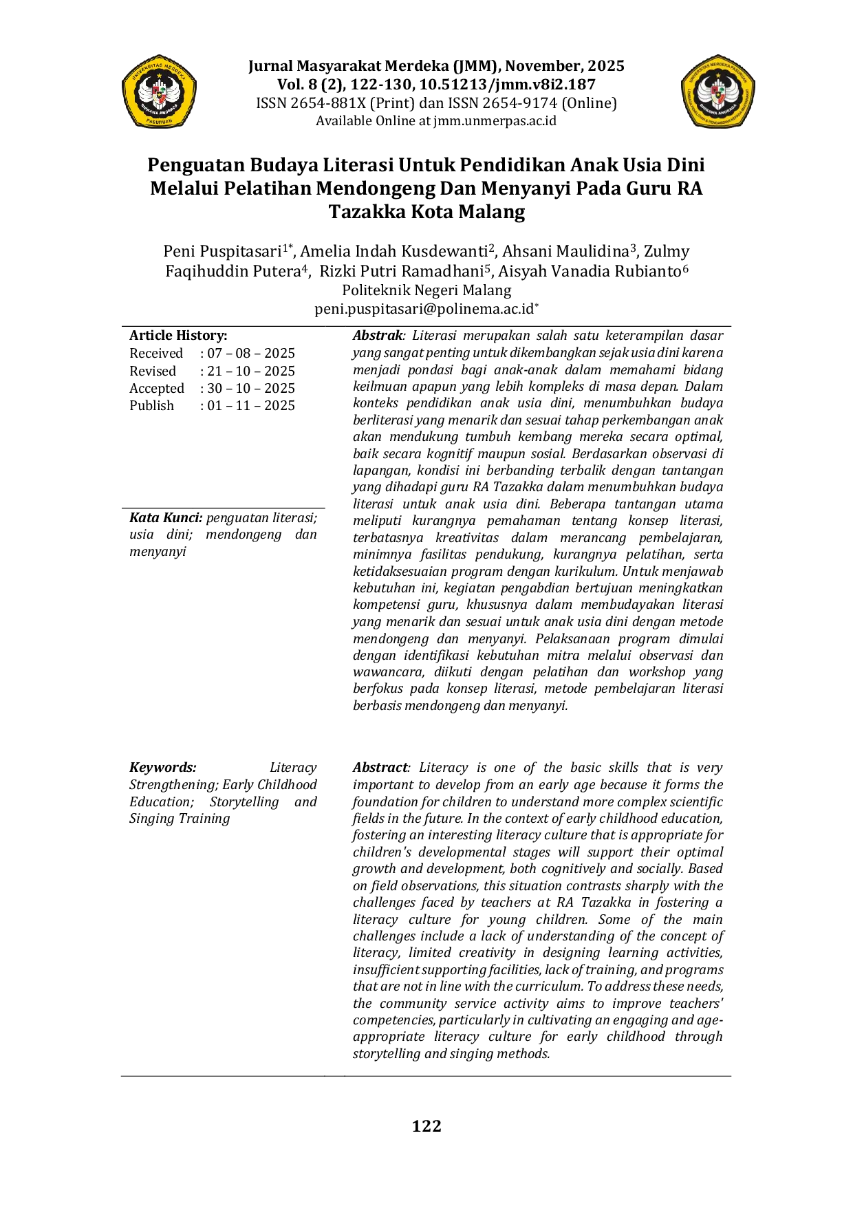 JMM - Jurnal Masyarakat MerdekaJMM - Jurnal Masyarakat MerdekaLiterasi merupakan salah satu keterampilan dasar yang sangat penting untuk dikembangkan sejak usia dini karena menjadi pondasi bagi anak-anak dalam memahami bidang keilmuan apapun yang lebih kompleks di masa depan. Dalam konteks pendidikan anak usia dini, menumbuhkan budaya berliterasi yang menarik dan sesuai tahap perkembangan anak akan mendukung tumbuh kembang mereka secara optimal, baik secara kognitif maupun sosial. Berdasarkan observasi di lapangan, kondisi ini berbanding terbalik dengan tantangan yang dihadapi guru RA Tazakka dalam menumbuhkan budaya literasi untuk anak usia dini. Beberapa tantangan utama meliputi kurangnya pemahaman tentang konsep literasi, terbatasnya kreativitas dalam merancang pembelajaran, minimnya fasilitas pendukung, kurangnya pelatihan, serta ketidaksesuaian program dengan kurikulum. Untuk menjawab kebutuhan ini, kegiatan pengabdian bertujuan meningkatkan kompetensi guru, khususnya dalam membudayakan literasi yang menarik dan sesuai untuk anak usia dini dengan metode mendongeng dan menyanyi. Pelaksanaan program dimulai dengan identifikasi kebutuhan mitra melalui observasi dan wawancara, diikuti dengan pelatihan dan workshop yang berfokus pada konsep literasi, metode pembelajaran literasi berbasis mendongeng dan menyanyi.
