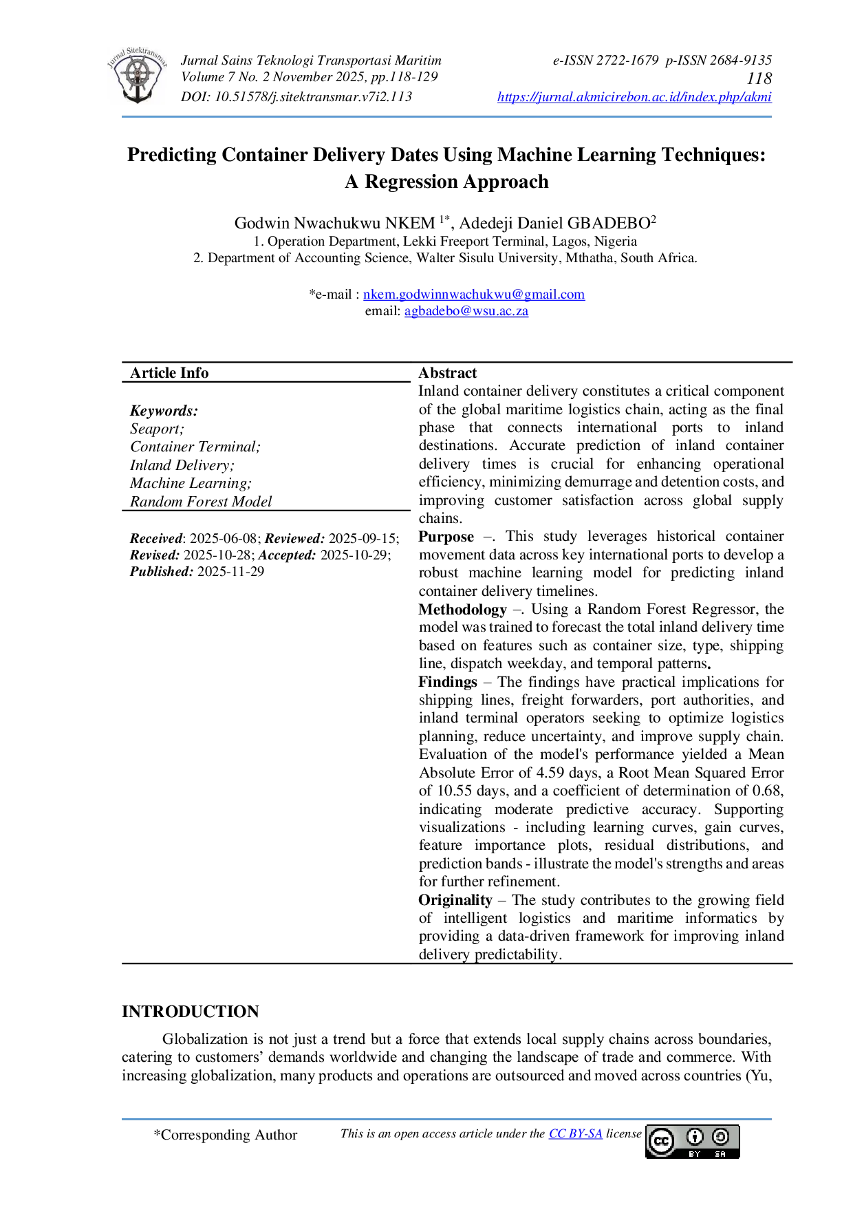Jurnal Sains Teknologi Transportasi MaritimJurnal Sains Teknologi Transportasi MaritimPengiriman kontainer ke dalam darat merupakan komponen penting dalam rantai logistik maritim global, berfungsi sebagai fase akhir menuju tujuan akhir di dalam darat. Prediksi yang akurat terhadap waktu pengiriman kontainer ke dalam darat sangat penting untuk meningkatkan efisiensi operasional, meminimalkan biaya demurage dan penahanan, serta meningkatkan kepuasan pelanggan dalam rantai pasok global. Penelitian ini memanfaatkan data pergerakan kontainer historis dari pelabuhan internasional utama untuk mengembangkan model pembelajaran mesin yang kuat dalam memprediksi jadwal pengiriman kontainer ke dalam darat. Metode yang digunakan adalah Random Forest Regressor, yang dilatih untuk memperkirakan total waktu pengiriman ke dalam darat berdasarkan fitur-fitur seperti ukuran kontainer, tipe, jalur pelayaran, hari pengiriman, dan pola temporal. Evaluasi model menunjukkan Mean Absolute Error sebesar 4,59 hari, Root Mean Squared Error sebesar 10,55 hari, dan koefisien determinasi (R²) sebesar 0,68, yang menunjukkan akurasi prediksi moderat. Visualisasi pendukung seperti kurva belajar, kurva gain, diagram pentingnya fitur, distribusi residual, dan pita prediksi memperlihatkan keunggulan model serta area yang perlu penyempurnaan lebih lanjut. Penelitian ini memberikan kontribusi pada bidang logistik cerdas dan informatika maritim dengan menyediakan kerangka kerja berbasis data untuk meningkatkan kemampuan prediksi pengiriman ke dalam darat.