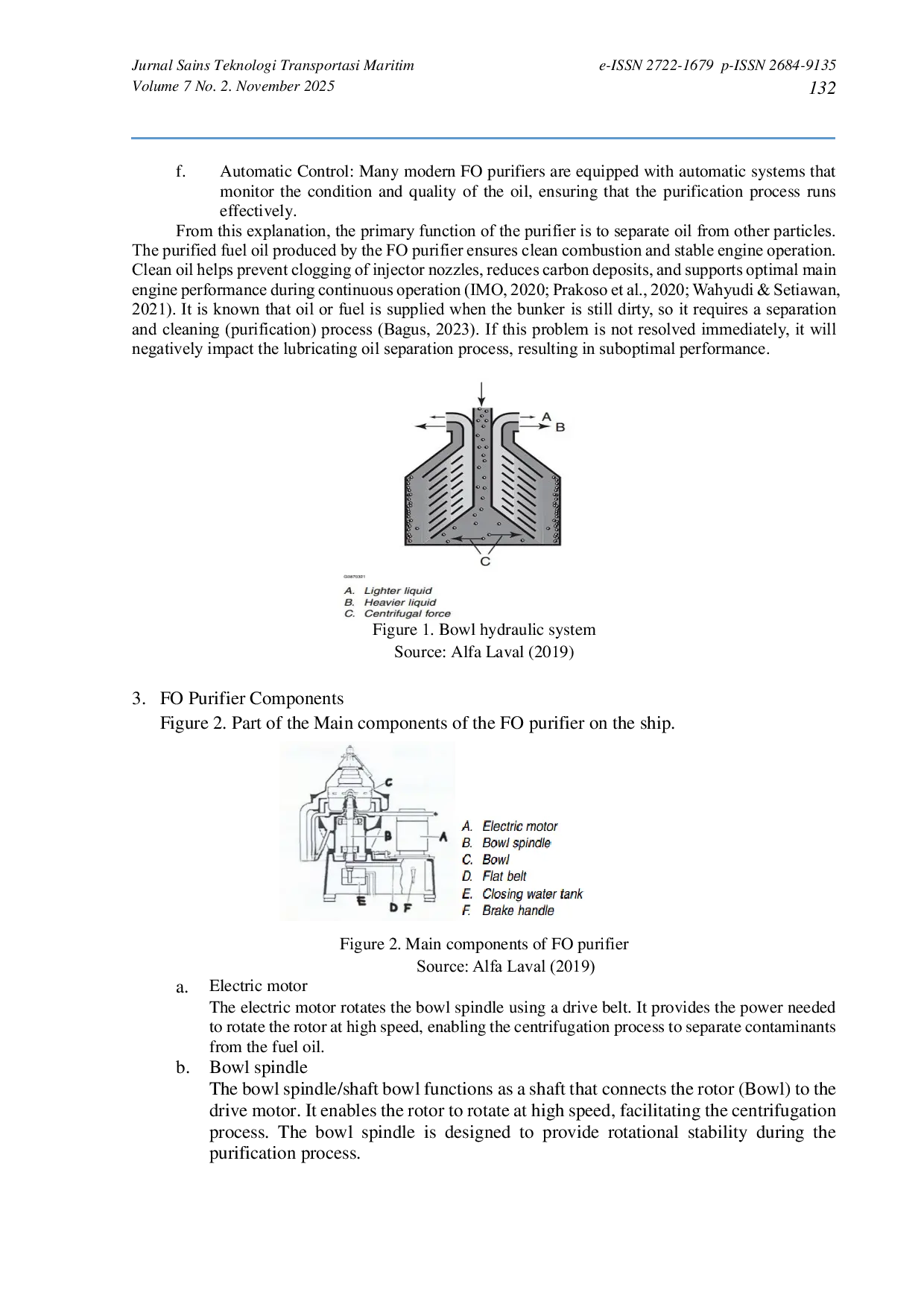 Jurnal Sains Teknologi Transportasi MaritimJurnal Sains Teknologi Transportasi MaritimPenguat mesin FO purifier di atas kapal merupakan mesin bantu yang kritis dalam sistem bahan bakar. Mesin ini memisahkan minyak bahan bakar dari udara, lumpur, dan kotoran. Selama praktik laut pada MV Manalagi Tara, mesin FO purifier mengalami kerusakan yang menyebabkan bocornya minyak ke saluran lumpur, sehingga menurunkan kinerja purifier. Penelitian ini bertujuan mengidentifikasi faktor-faktor yang menyebabkan penurunan kinerja rotasi mangkuk pada FO purifier, dampak kegagalan rotasi mangkuk, serta performa yang gagal. Metode yang digunakan bersifat kualitatif dengan teknik analisis fishbone. Hasil menunjukkan bahwa faktor-faktor penyebab meliputi mangkuk kotor, sabuk datar yang longgar, bantalan poros mangkuk yang rusak, dan poros mangkuk yang aus; dampaknya meliputi rotasi tidak stabil, getaran berlebih, dan penurunan efisiensi pemurnian. Upaya perbaikan yang dapat dilakukan antara lain pembersihan mangkuk, penyesuaian ketegangan sabuk, serta penggantian bantalan dan poros yang aus. Penelitian ini memberikan pemahaman tentang pengaruh kondisi mekanik dan degradasi material terhadap kinerja purifier dalam operasi kapal nyata.