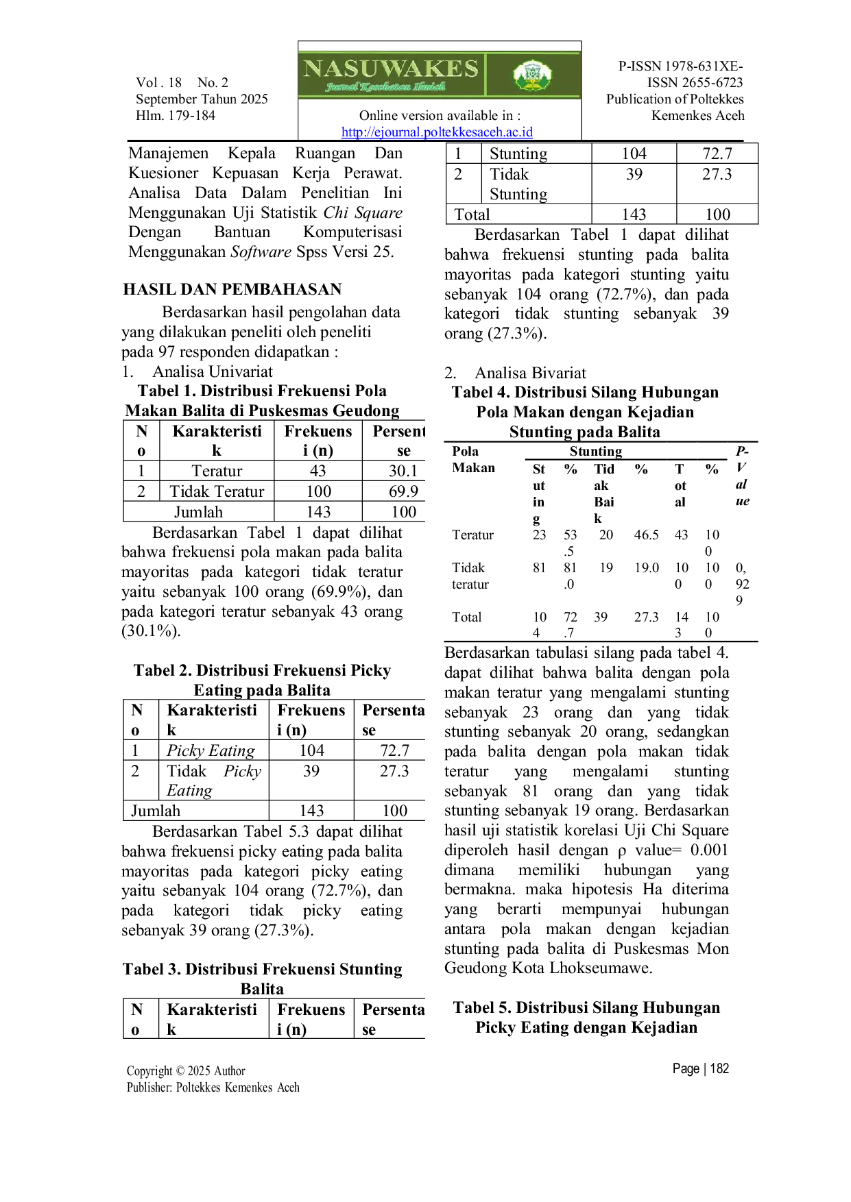 NASUWAKES: Jurnal Kesehatan IlmiahNASUWAKES: Jurnal Kesehatan IlmiahStunting adalah kondisi gagal tumbuh pada anak balita akibat kekurangan gizi kronis terutama pada 1.000 Hari Pertama Kehidupan (HPK). Faktor yang mempengaruhi kejadian stunting diantaranya ialah pola makan dan Picky Eating. Tujuan penelitian adalah untuk mengetahui Hubungan Pola Makan dan Picky Eating dengan Kejadian Stunting Pada Balita di Wilayah Kerja Puskesmas Mon Geudong. Pada penelitian ini rancangan penelitian yang digunakan yaitu deskriptif korelasional dengan pendekatan cross-sectional. Populasi dalam penelitian ini adalah balita berjumlah 224 orang. Sampel ada penelitian ini berjumlah 143 orang. Berdasarkan hasil uji statistik korelasi Uji Chi Square diperoleh hasil dengan p value 0.001 dan dengan tingkat keeratan hubungan yaitu tidak berhubungan. Hal ini menunjukkan bahwa ρ value< α maka hipotesis Ha1 diterima dan Ho1 ditolak yang berarti ada hubungan pola makan dengan kejadian stunting pada balita. Berdasarkan hasil uji statistik korelasi Uji Chi Square diperoleh hasil dengan p value 0.000 dan dengan tingkat keeratan hubungan yaitu berhubungan. Hal ini menunjukkan bahwa ρ value< α maka hipotesis Ha2 diterima dan Ho2 ditolak yang berarti ada hubungan picky eating dengan kejadian stunting pada balita. Diharapkan dapat memberikan edukasi terkait pola makan dan picky eating dengan kejadian stunting.