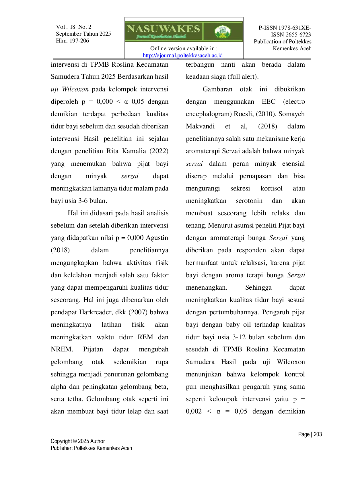 NASUWAKES: Jurnal Kesehatan IlmiahNASUWAKES: Jurnal Kesehatan IlmiahPada tahap pertumbuhan bayi, menjaga kualitas tidur merupakan hal yang harus diperhatikan mengingat pentingnya proses tidur bagi pertumbuhan dan perkembangan rotaknya. Pijat bayi dengan minyak 2025 merupakan salah satu cara yang menyenangkan untuk membuat kualitas tidur bayi menjadi lebih baik. Tujuan dari penelitian ini adalah mengetahui pengaruh pijat bayi dengan minyak 2025 terhadap kualitas tidur bayi usia 3-12 bulan di TPMB Roslina Kecamatan Samudera tahun 2025. Metode penelitian ini adalah Quasy Eksperiement dengan rancangan two grup pre test and post test. Kegiatan penelitian dilakukan pada bulan November sampai Oktober 2025. Populasi dalam penelitian ini berjumlah 50 bayi usia 3-12 bulan. Teknik sample yang digunakan yaitu purposive sampling dan didapat 30 Responden. Uji statistik menggunakan uji Wilcoxon. Dari hasil statistik menunjukkan peningkatan kualitas tidur, pada kelompok intervensi lebih tinggi dibandingkan dengan kelompok kontrol (±4,00>±3,00). Hasil uji statistik menunjukkan p‑value 0,000 > 0,05 maka, kesimpulannya terdapat Pengaruh Pijat Bayi Terhadap Kualitas Tidur Bayi Usia 3-12 Bulan Di TPMB Roslina Kecamatan Samudera Tahun 2025. Saran bagi peneliti selanjutnya untuk lebih mendalami dan menambah variabel agar lebih variatif.