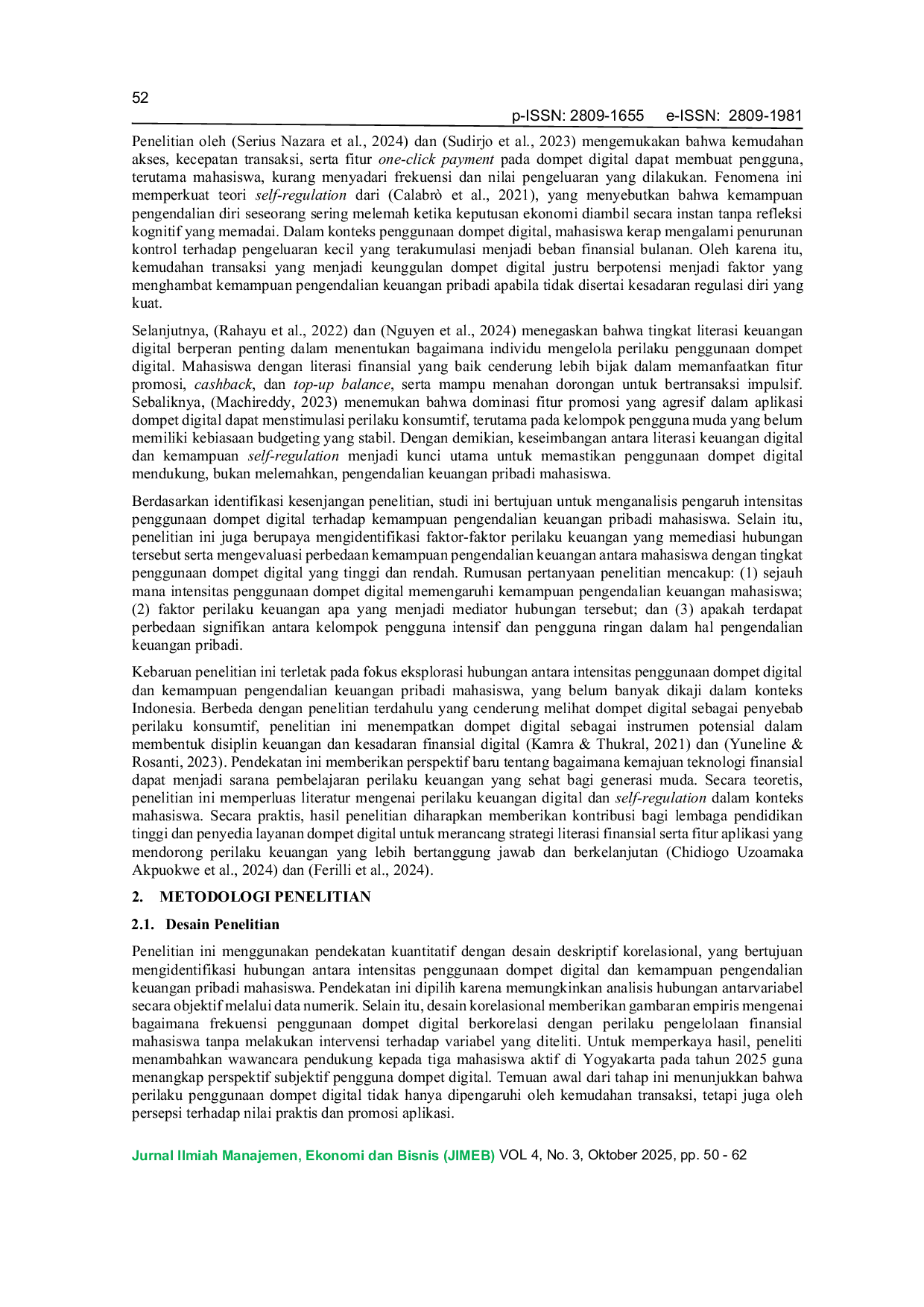 Intensitas penggunaan dompet digital berpengaruh signifikan terhadap kemampuan pengendalian keuangan pribadi mahasiswa.Penggunaan yang disertai pemanfaatan fitur pemantauan transaksi dan notifikasi terbukti meningkatkan kesadaran finansial, sementara kemudahan akses dan promosi digital berpotensi mendorong perilaku konsumtif apabila tidak diimbangi kemampuan self-regulation yang memadai.