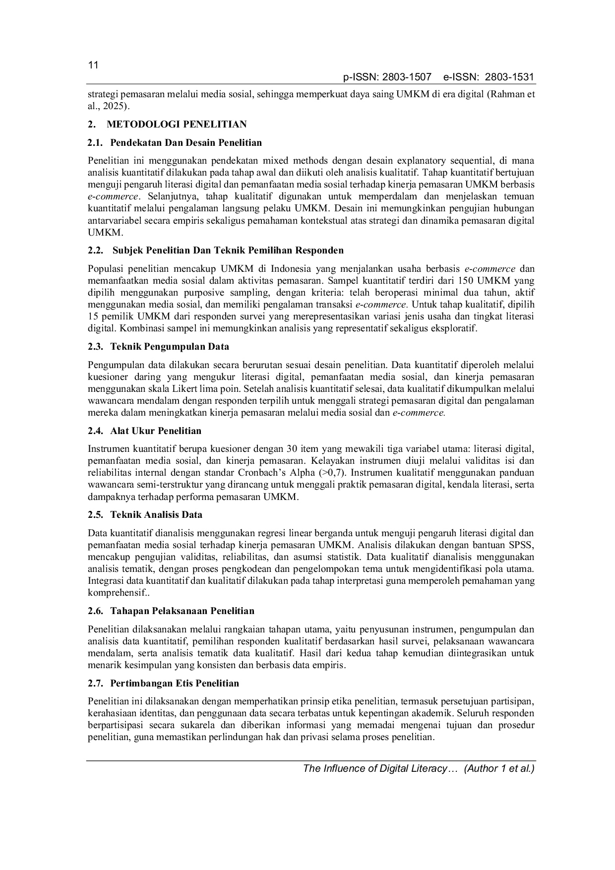 Penelitian ini membuktikan bahwa literasi digital dan pemanfaatan media sosial berpengaruh signifikan terhadap kinerja pemasaran UMKM e-commerce di Indonesia, dengan media sosial sebagai faktor paling dominan.Literasi digital berfungsi sebagai fondasi pengelolaan teknologi dan informasi, sementara media sosial menjadi sarana utama implementasi strategi pemasaran.Hasil penelitian menegaskan pentingnya pengembangan literasi digital yang aplikatif dan terintegrasi dengan strategi media sosial untuk meningkatkan daya saing UMKM.