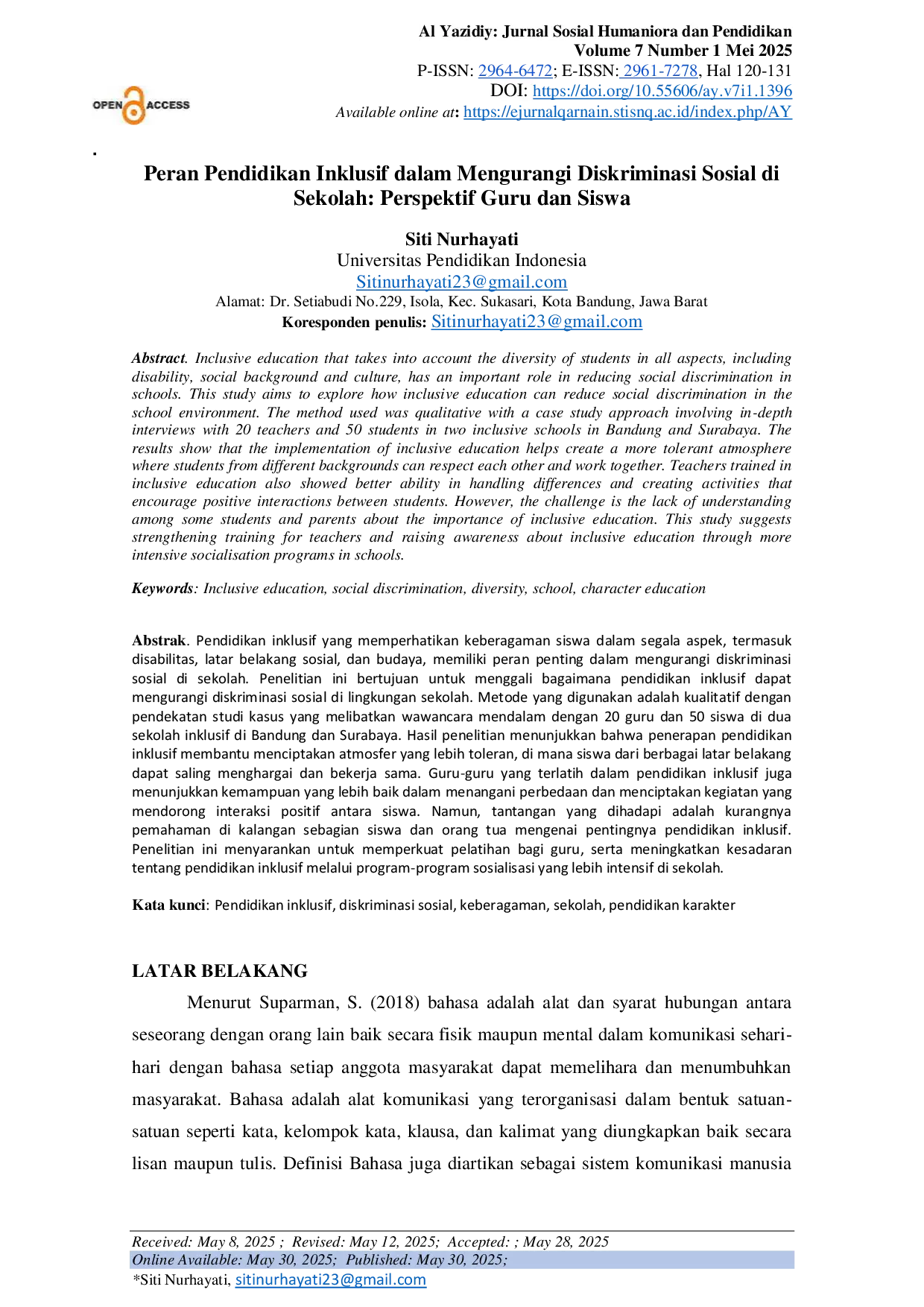 Al Yazidiy Jurnal Sosial Humaniora dan PendidikanAl Yazidiy Jurnal Sosial Humaniora dan PendidikanPendidikan inklusif yang memperhatikan keberagaman siswa dalam segala aspek, termasuk disabilitas, latar belakang sosial, dan budaya, memiliki peran penting dalam mengurangi diskriminasi sosial di sekolah. Penelitian ini bertujuan untuk menggali bagaimana pendidikan inklusif dapat mengurangi diskriminasi sosial di lingkungan sekolah. Metode yang digunakan adalah kualitatif dengan pendekatan studi kasus yang melibatkan wawancara mendalam dengan 20 guru dan 50 siswa di dua sekolah inklusif di Bandung dan Surabaya. Hasil penelitian menunjukkan bahwa penerapan pendidikan inklusif membantu menciptakan atmosfer yang lebih toleran, di mana siswa dari berbagai latar belakang dapat saling menghargai dan bekerja sama. Guru-guru yang terlatih dalam pendidikan inklusif juga menunjukkan kemampuan yang lebih baik dalam menangani perbedaan dan menciptakan kegiatan yang mendorong interaksi positif antara siswa. Namun, tantangan yang dihadapi adalah kurangnya pemahaman di kalangan sebagian siswa dan orang tua mengenai pentingnya pendidikan inklusif. Penelitian ini menyarankan untuk memperkuat pelatihan bagi guru, serta meningkatkan kesadaran tentang pendidikan inklusif melalui program-program sosialisasi yang lebih intensif di sekolah.