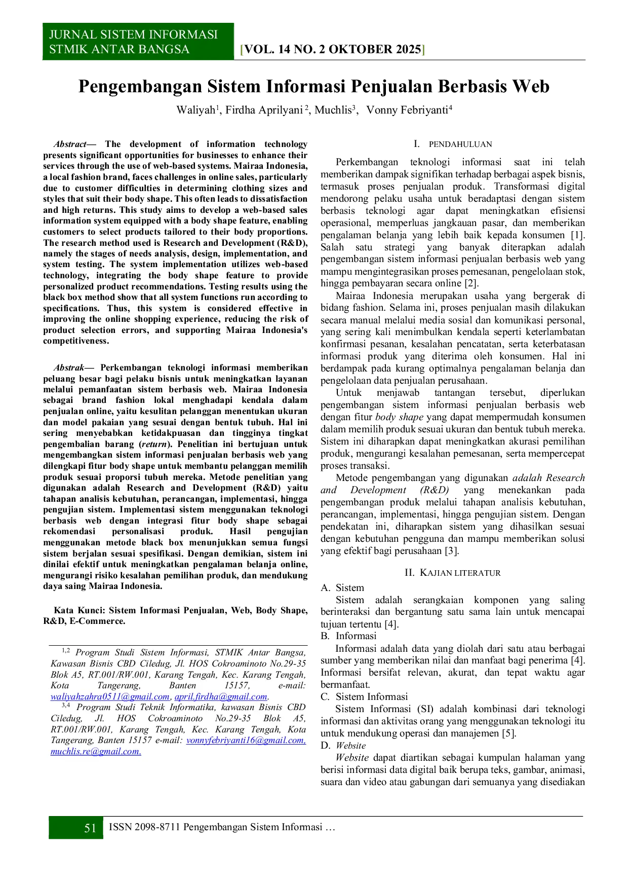 Jurnal Sistem InformasiJurnal Sistem InformasiPerkembangan teknologi informasi memberikan peluang besar bagi pelaku bisnis untuk meningkatkan layanan melalui pemanfaatan sistem berbasis web. Mairaa Indonesia lokal menghadapi kendala dalam penjualan online, yaitu kesulitan pelanggan menentukan ukuran dan model pakaian yang sesuai dengan bentuk tubuh. Hal ini sering menyebabkan ketidakpuasan dan tingginya tingkat pengembalian barang (return). Penelitian ini bertujuan untuk mengembangkan sistem informasi penjualan berbasis web yang dilengkapi fitur body shape untuk membantu pelanggan memilih produk sesuai proporsi tubuh mereka. Metode penelitian yang digunakan adalah Research and Development (R&D) yaitu tahapan analisis kebutuhan, perancangan, implementasi, hingga pengujian sistem. Implementasi sistem menggunakan teknologi berbasis web dengan integrasi fitur body shape sebagai rekomendasi personalisasi produk. Hasil pengujian menggunakan metode black box menunjukkan semua fungsi sistem berjalan sesuai spesifikasi. Dengan demikian, sistem ini dinilai efektif untuk meningkatkan pengalaman belanja online, mengurangi risiko kesalahan pemilihan produk, dan mendukung daya saing Mairaa Indonesia.