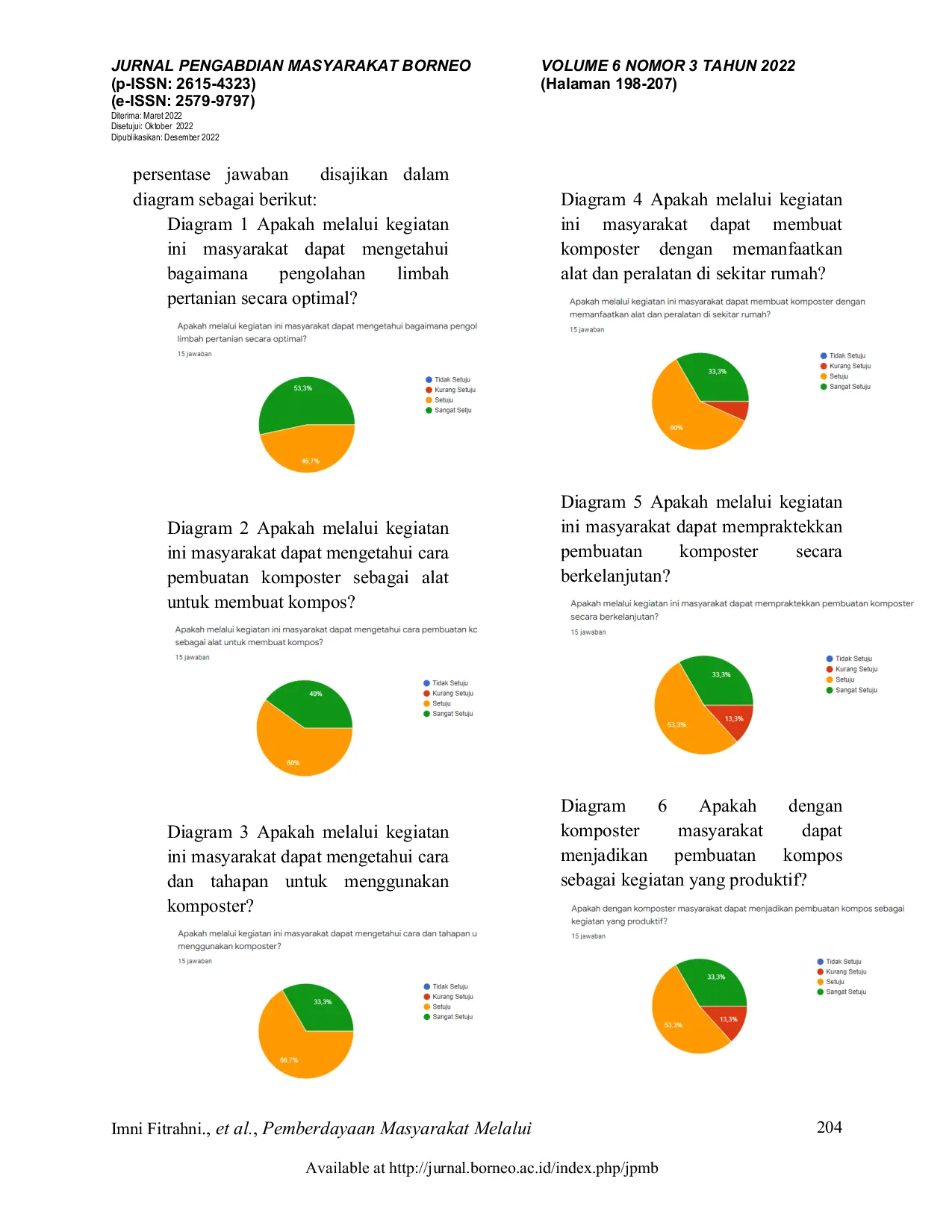 Jurnal Pengabdian Masyarakat BorneoJurnal Pengabdian Masyarakat BorneoMata pencaharian masyarakat sebagai petani memberikan kontribusi yang besar terhadap kuantitas dan kualitas limbah pertanian yang dihasilkan. Meningkatnya volume timbulan limbah tersebut tentunya memerlukan pengelolaan. Hal inilah yang mendasari dilakukan kegiatan pemberdayaan masyarakat dengan memberikan penyuluhan dan pelatihan pembuatan komposter. Kegiatan ini bertujuan untuk memberikan transfer pengetahuan kepada masyarakat melalui pengolahan limbah pertanian dengan cara membuat pupuk kompos menggunakan komposter. Adapun metode yang digunakan dalam kegiatan ini adalah penyuluhan, pelatihan, pendampingan, monitoring, dan pengembangan usaha setelah dilakukannya pelatihan dan pendampingan, dengan menerapkan metode di atas secara tetap, masyarakat bisa mengetahui cara dan tahapan untuk menggunakan komposter dengan membuat pupuk kompos dari limbah pertanian. Melalui kegiatan ini diharapkan dapat melatih masyarakat dalam pembuatan komposter untuk membuat kompos dari limbah hasil pertanian sehingga masyarakat bisa melakukan pengolahan limbah pertanian dengan benar dan dapat dilakukan di mana saja dengan peralatan apa saja serta dapat berkelanjutan. Kegiatan pelatihan ini dilakukan di Desa Balok dimana subjek dari kegiatan pelatihan ini merupakan 5 orang kelompok tani dan 10 orang karang taruna di desa tersebut. Hasil dari kegiatan ini menunjukkan bahwa masyarakat menunjukkan sikap antusias dan bisa memanfaatkan secara benar dan tepat dalam menggunakan komposter sebagai pengolahan sampah limbah pertanian menjadi kompos. Hal ini dibuktikan dengan tingkat pemahaman masyarakat yang serta kesediaan warga untuk mendukung terlaksananya kegiatan ini.