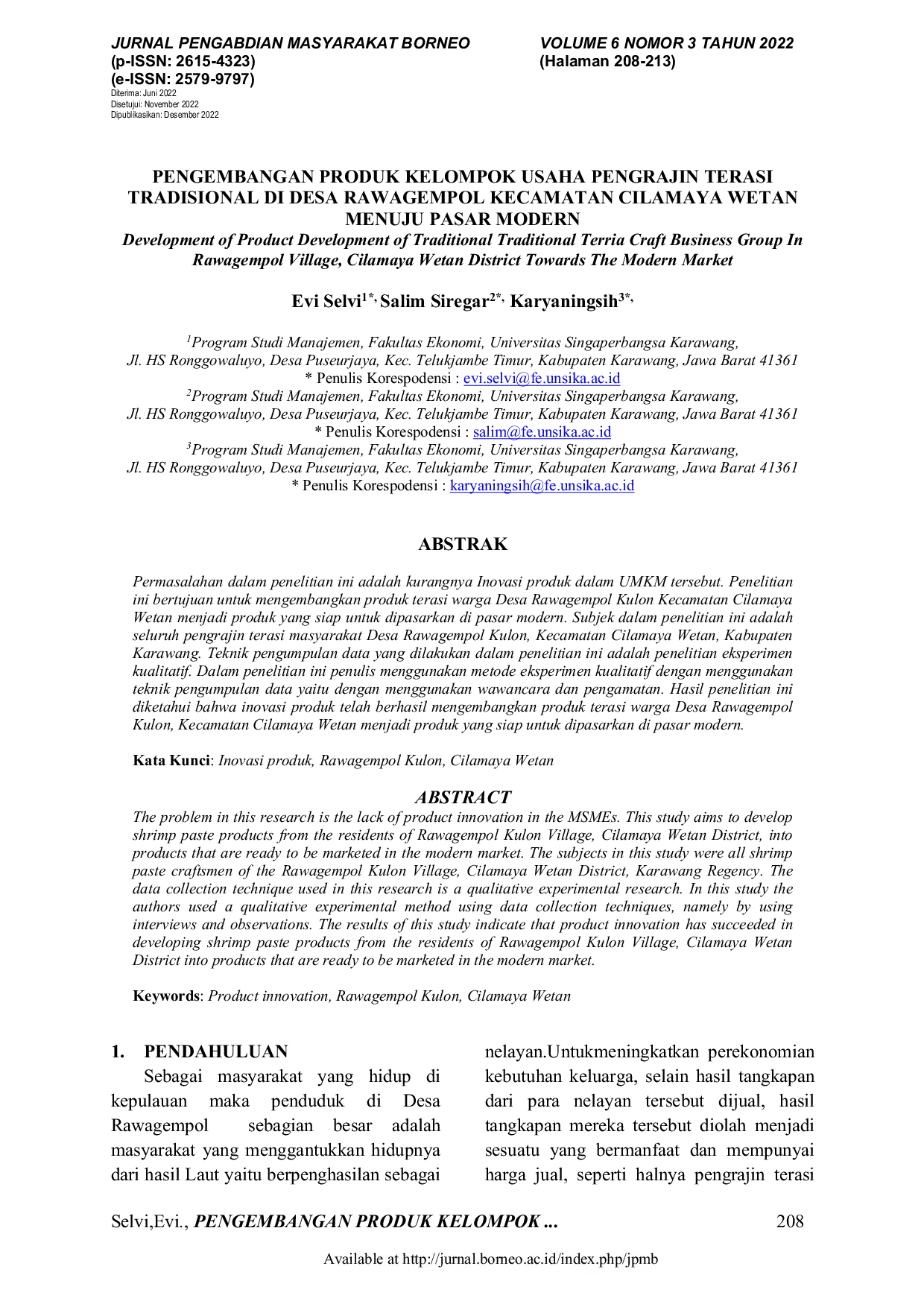 Jurnal Pengabdian Masyarakat BorneoJurnal Pengabdian Masyarakat BorneoPermasalahan dalam penelitian ini adalah kurangnya inovasi produk dalam UMKM tersebut. Penelitian ini bertujuan untuk mengembangkan produk terasi warga Desa Rawagempol Kulon Kecamatan Cilamaya Wetan menjadi produk yang siap untuk dipasarkan di pasar modern. Subjek dalam penelitian ini adalah seluruh pengrajin terasi masyarakat Desa Rawagempol Kulon, Kecamatan Cilamaya Wetan, Kabupaten Karawang. Teknik pengumpulan data yang dilakukan dalam penelitian ini adalah penelitian eksperimen kualitatif. Dalam penelitian ini penulis menggunakan metode eksperimen kualitatif dengan menggunakan teknik pengumpulan data yaitu dengan menggunakan wawancara dan pengamatan. Hasil penelitian ini diketahui bahwa inovasi produk telah berhasil mengembangkan produk terasi warga Desa Rawagempol Kulon, Kecamatan Cilamaya Wetan menjadi produk yang siap untuk dipasarkan di pasar modern.
