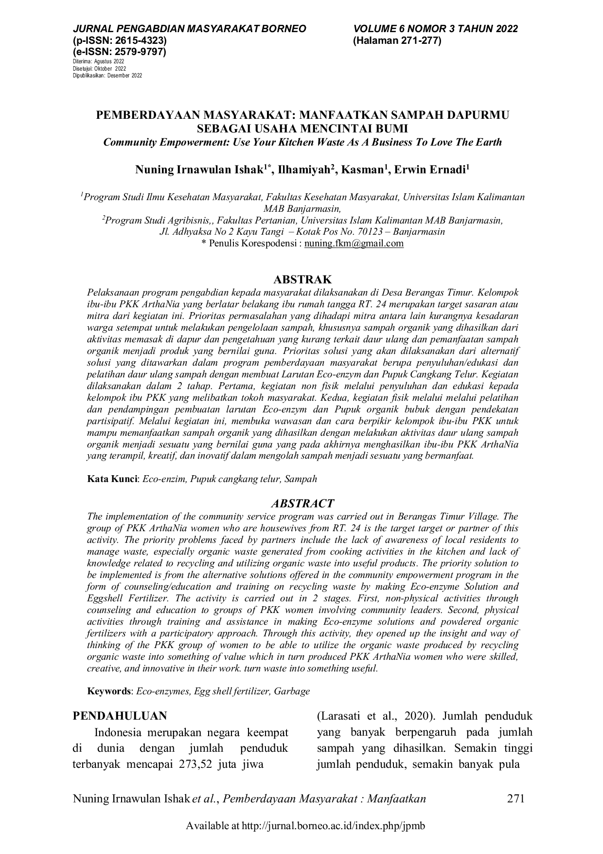 Jurnal Pengabdian Masyarakat BorneoJurnal Pengabdian Masyarakat BorneoPelaksanaan program pengabdian kepada masyarakat dilaksanakan di Desa Berangas Timur. Kelompok ibu-ibu PKK ArthaNia yang berlatar belakang ibu rumah tangga RT. 24 merupakan target sasaran atau mitra dari kegiatan ini. Prioritas permasalahan yang dihadapi mitra antara lain kurangnya kesadaran warga setempat untuk melakukan pengelolaan sampah, khususnya sampah organik yang dihasilkan dari aktivitas memasak di dapur dan pengetahuan yang kurang terkait daur ulang dan pemanfaatan sampah organik menjadi produk yang bernilai guna. Prioritas solusi yang akan dilaksanakan dari alternatif solusi yang ditawarkan dalam program pemberdayaan masyarakat berupa penyuluhan/edukasi dan pelatihan daur ulang sampah dengan membuat Larutan Eco-enzym dan Pupuk Cangkang Telur. Kegiatan dilaksanakan dalam 2 tahap. Pertama, kegiatan non fisik melalui penyuluhan dan edukasi kepada kelompok ibu PKK yang melibatkan tokoh masyarakat. Kedua, kegiatan fisik melalui melalui pelatihan dan pendampingan pembuatan larutan Eco-enzym dan Pupuk organik bubuk dengan pendekatan partisipatif. Melalui kegiatan ini, membuka wawasan dan cara berpikir kelompok ibu-ibu PKK untuk mampu memanfaatkan sampah organik yang dihasilkan dengan melakukan aktivitas daur ulang sampah organik menjadi sesuatu yang bernilai guna yang pada akhirnya menghasilkan ibu-ibu PKK ArthaNia yang terampil, kreatif, dan inovatif dalam mengolah sampah menjadi sesuatu yang bermanfaat.