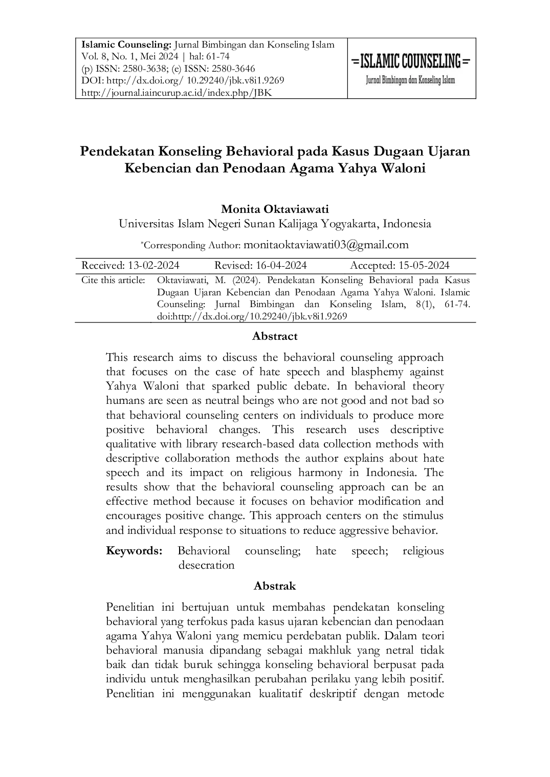 - Pendekatan Konseling Behavioral pada Kasus Dugaan Ujaran Kebencian dan Penodaan Agama Yahya Waloni |... journal.iaincurup.ac.id/index.php/JBK/article/view/9269Pendekatan Konseling Behavioral pada Kasus Dugaan Ujaran Kebencian dan Penodaan Agama Yahya Waloni journal iaincurup ac index php JBK article view 9269