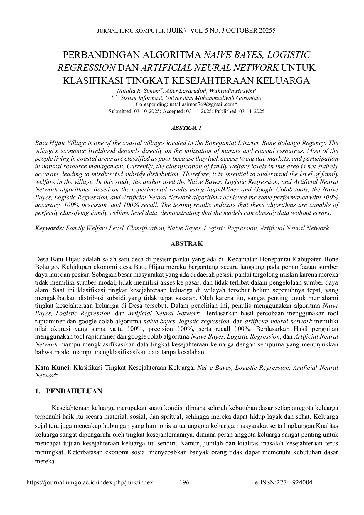 Jurnal Ilmu Komputer (JUIK)Jurnal Ilmu Komputer (JUIK)Desa Batu Hijau adalah salah satu desa di pesisir pantai yang ada di Kecamatan Bonepantai Kabupaten Bone Bolango. Kehidupan ekonomi desa Batu Hijau mereka bergantung secara langsung pada pemanfaatan sumber daya laut dan pesisir. Sebagian besar masyarakat yang ada di daerah pesisir pantai tergolong miskin karena mereka tidak memiliki sumber modal, tidak memiliki akses ke pasar, dan tidak terlibat dalam pengelolaan sumber daya alam. Saat ini klasifikasi tingkat kesejahteraan keluarga di wilayah tersebut belum sepenuhnya tepat yang mengakibatkan distribusi subsidi yang tidak tepat sasaran. Oleh karena itu, sangat penting untuk memahami tingkat kesejahteraan keluarga di Desa tersebut. Dalam penelitian ini, penulis menggunakan algoritma Naive Bayes, Logistic Regression, dan Artificial Neural Network. Berdasarkan hasil percobaan menggunakan tool rapidminer dan google colab algoritma Naive Bayes, Logistic Regression, dan Artificial Neural Network memiliki nilai akurasi yang sama yaitu 100%, precision 100%, serta recall 100%. Berdasarkan Hasil pengujian menggunakan tool rapidminer dan google colab algoritma Naive Bayes, Logistic Regression, dan Artificial Neural Network mampu mengklasifikasikan data tingkat kesejahteraan keluarga dengan sempurna yang menunjukkan bahwa model mampu mengklasifikasikan data tanpa kesalahan.