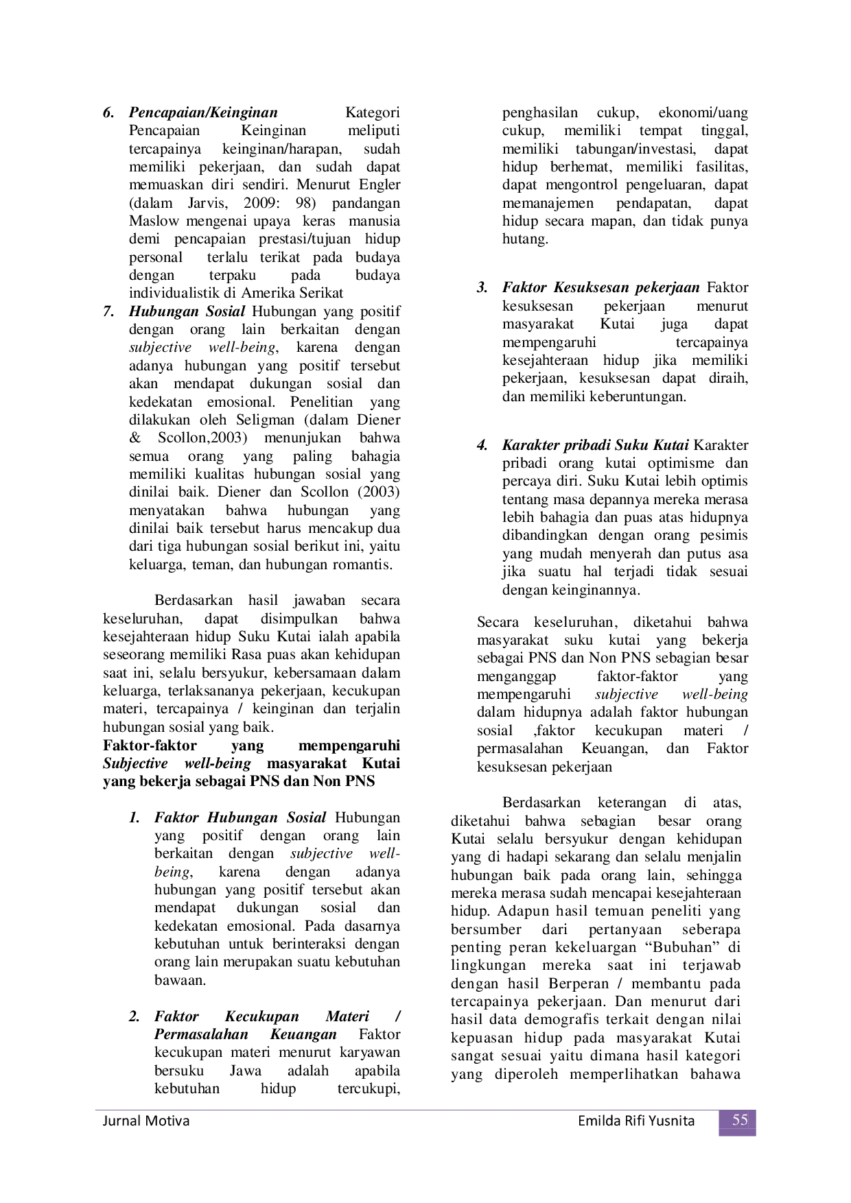 Berdasarkan hasil penelitian di lapangan yang dilakukan pada masyrakat Suku Kutai yang bekerja sebagai PNS dan Non PNS dapat disimpulkan bahwa.(1) Subjective Well-Being masyarakat Suku Kutai adalah kondisi dimana seseorang memiliki Rasa puas akan kehidupan saat ini, selalu bersyukur, kebersamaan dalam keluarga, terjalinya hubungan sosial dan terlaksananya pekerjaan dengan baik untuk memperoleh pencapaian/keinginan.Dan tidak ada perbedaan pengertian SWB menurut masyarakat Suku Kutai yang bekerja sebagai PNS dan Non PNS (2) Faktor-faktor yang mempengaruhi SWB masyarakat Suku Kutai, Diketahui bahwa faktor-faktor tersebut ialah faktor hubungan sosial, kecukupan materi dan faktor kesuksesan pekerjaan.