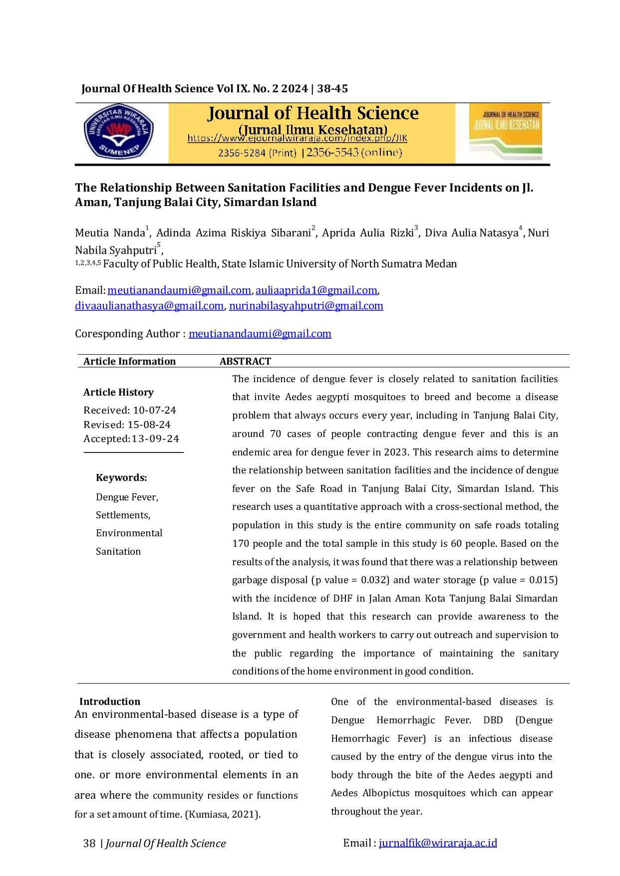 Journal Of Health Science (Jurnal Ilmu Kesehatan)Journal Of Health Science (Jurnal Ilmu Kesehatan)Penelitian ini bertujuan untuk mengetahui hubungan antara fasilitas sanitasi dan kejadian demam berdarah pada Jalan Aman di Kota Tanjung Balai, Pulau Simardan. Penelitian ini menggunakan pendekatan kuantitatif dengan metode cross-sectional, dengan populasi dalam penelitian ini adalah seluruh masyarakat di jalan Aman berjumlah 170 orang dan total sampel dalam penelitian ini adalah 60 orang. Berdasarkan hasil analisis, ditemukan bahwa terdapat hubungan antara pembuangan sampah (nilai p = 0,032) dan penampungan air (nilai p = 0,015) dengan kejadian DHF di Jalan Aman Kota Tanjung Balai Simardan Island. Diharapkan penelitian ini dapat memberikan kesadaran kepada pemerintah dan petugas kesehatan untuk melakukan penyuluhan dan pengawasan kepada masyarakat mengenai pentingnya menjaga kondisi sanitasi lingkungan rumah agar tetap dalam kondisi baik.