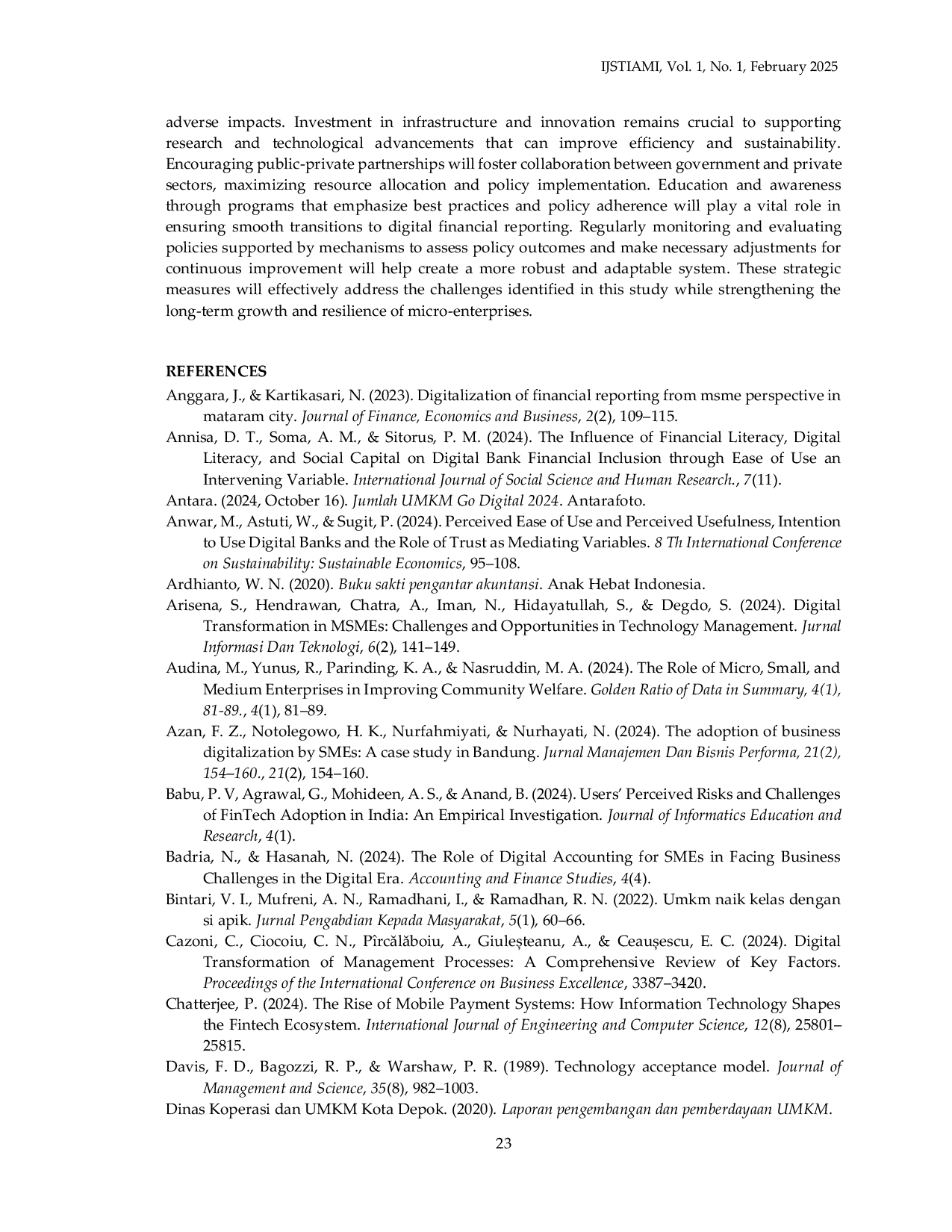 IJSTIAMI : International Journal of Social, Tax, Information, Administration, Management and InnovationIJSTIAMI : International Journal of Social, Tax, Information, Administration, Management and InnovationPenggunaan teknologi digital menawarkan berbagai manfaat. Namun, tingkat adopsi digital di kalangan usaha mikro masih relatif rendah, terutama dalam penggunaan aplikasi pelaporan keuangan digital. Hal ini terlihat dari masih banyaknya usaha mikro yang belum memiliki laporan keuangan meskipun sudah ada aplikasi yang dapat membantu mereka. Penelitian ini bertujuan untuk mengetahui persepsi pelaku usaha mikro di Kelurahan Cimpaeun, Kota Depok, terhadap adopsi aplikasi pelaporan keuangan digital. Metode penelitian menggunakan pendekatan kualitatif dengan jenis penelitian eksploratori. Data dikumpulkan melalui wawancara semi-terstruktur dengan tujuh informan usaha mikro di wilayah tersebut dan dianalisis menggunakan metode analisis konten. Hasil penelitian menunjukkan bahwa usaha mikro memiliki persepsi positif terhadap kemudahan dan efisiensi aplikasi dalam mengelola keuangan. Namun, hambatan seperti literasi digital yang terbatas, akses terhadap teknologi, biaya, dan keamanan data menjadi tantangan utama. Studi ini menemukan bahwa untuk meningkatkan tingkat adopsi pelaporan keuangan digital di kalangan usaha mikro, diperlukan pelatihan untuk meningkatkan literasi digital, pengembangan aplikasi yang ramah pengguna, dukungan teknologi, dan jaminan keamanan data untuk mempercepat adopsi aplikasi pelaporan keuangan digital.
