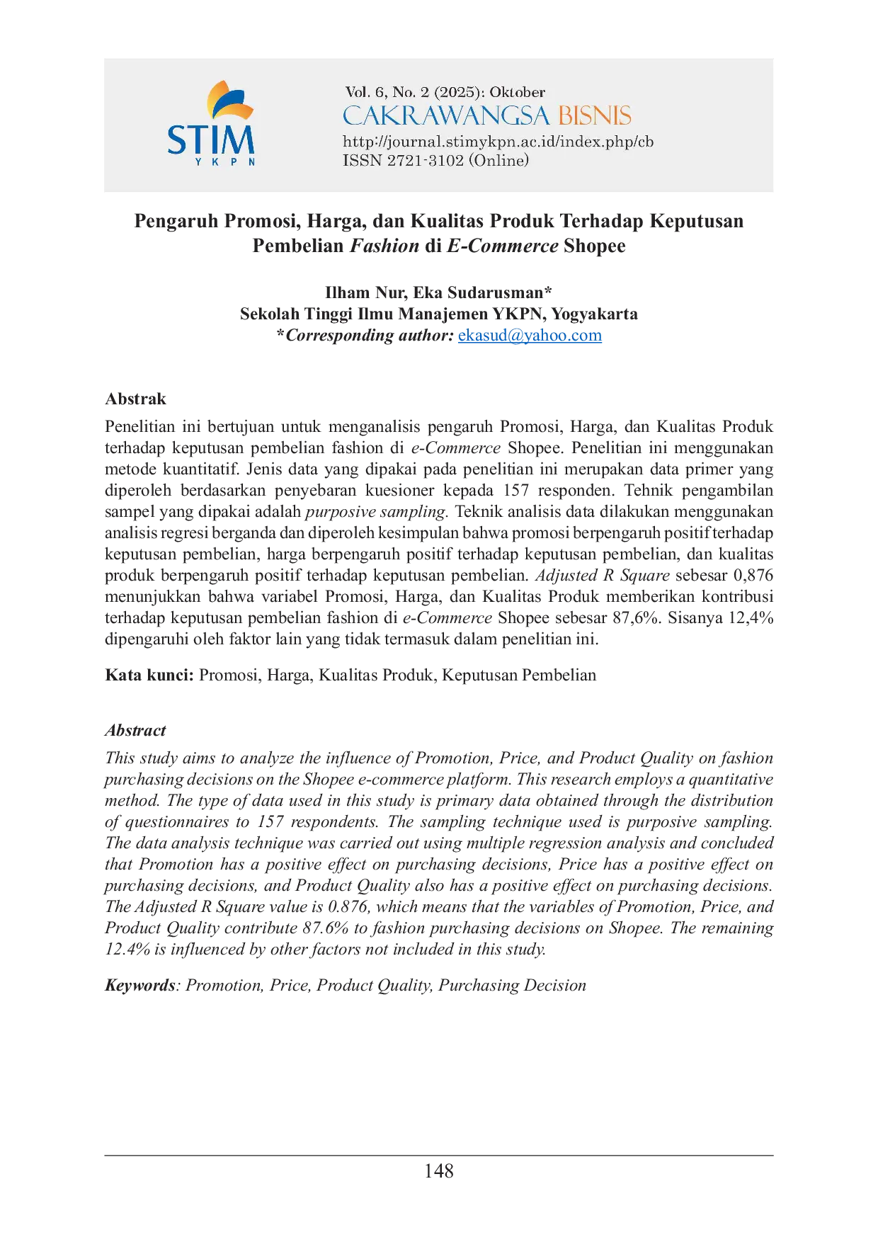 Cakrawangsa Bisnis: Jurnal Ilmiah MahasiswaCakrawangsa Bisnis: Jurnal Ilmiah MahasiswaPenelitian ini bertujuan untuk menganalisis pengaruh Promosi, Harga, dan Kualitas Produk terhadap keputusan pembelian fashion di e-Commerce Shopee. Penelitian ini menggunakan metode kuantitatif. Jenis data yang dipakai pada penelitian ini merupakan data primer yang diperoleh berdasarkan penyebaran kuesioner kepada 157 responden. Tehnik pengambilan sampel yang dipakai adalah purposive sampling. Teknik analisis data dilakukan menggunakan analisis regresi berganda dan diperoleh kesimpulan bahwa promosi berpengaruh positif terhadap keputusan pembelian, harga berpengaruh positif terhadap keputusan pembelian, dan kualitas produk berpengaruh positif terhadap keputusan pembelian. Adjusted R Square sebesar 0,876 menunjukkan bahwa variabel Promosi, Harga, dan Kualitas Produk memberikan kontribusi terhadap keputusan pembelian fashion di e-Commerce Shopee sebesar 87,6%. Sisanya 12,4% dipengaruhi oleh faktor lain yang tidak termasuk dalam penelitian ini.