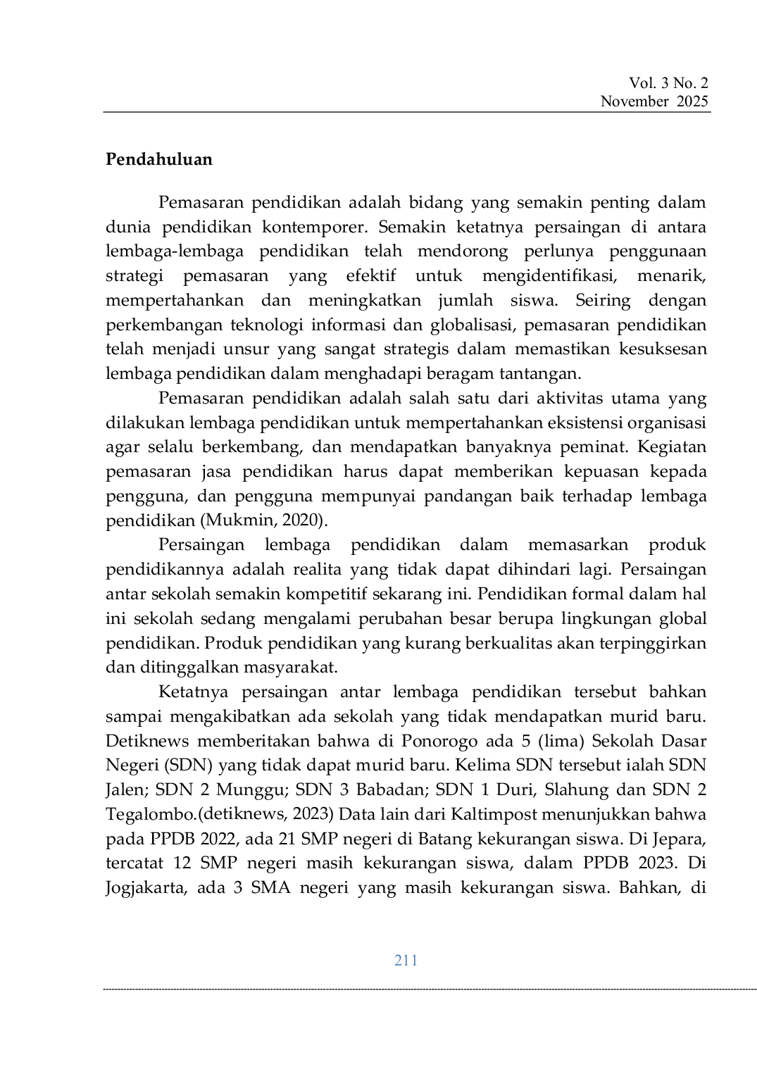 - MANAJEMEN MARKETING JASA PENDIDIKAN DI ERA DIGITAL | Jurnal Manajemen Pendidikan. manajemen marketing... doi.org/10.21009/jmp.v13i1.28335MANAJEMEN MARKETING JASA PENDIDIKAN DI ERA DIGITAL Jurnal Manajemen Pendidikan manajemen marketing doi 10 21009 jmp v13i1 28335