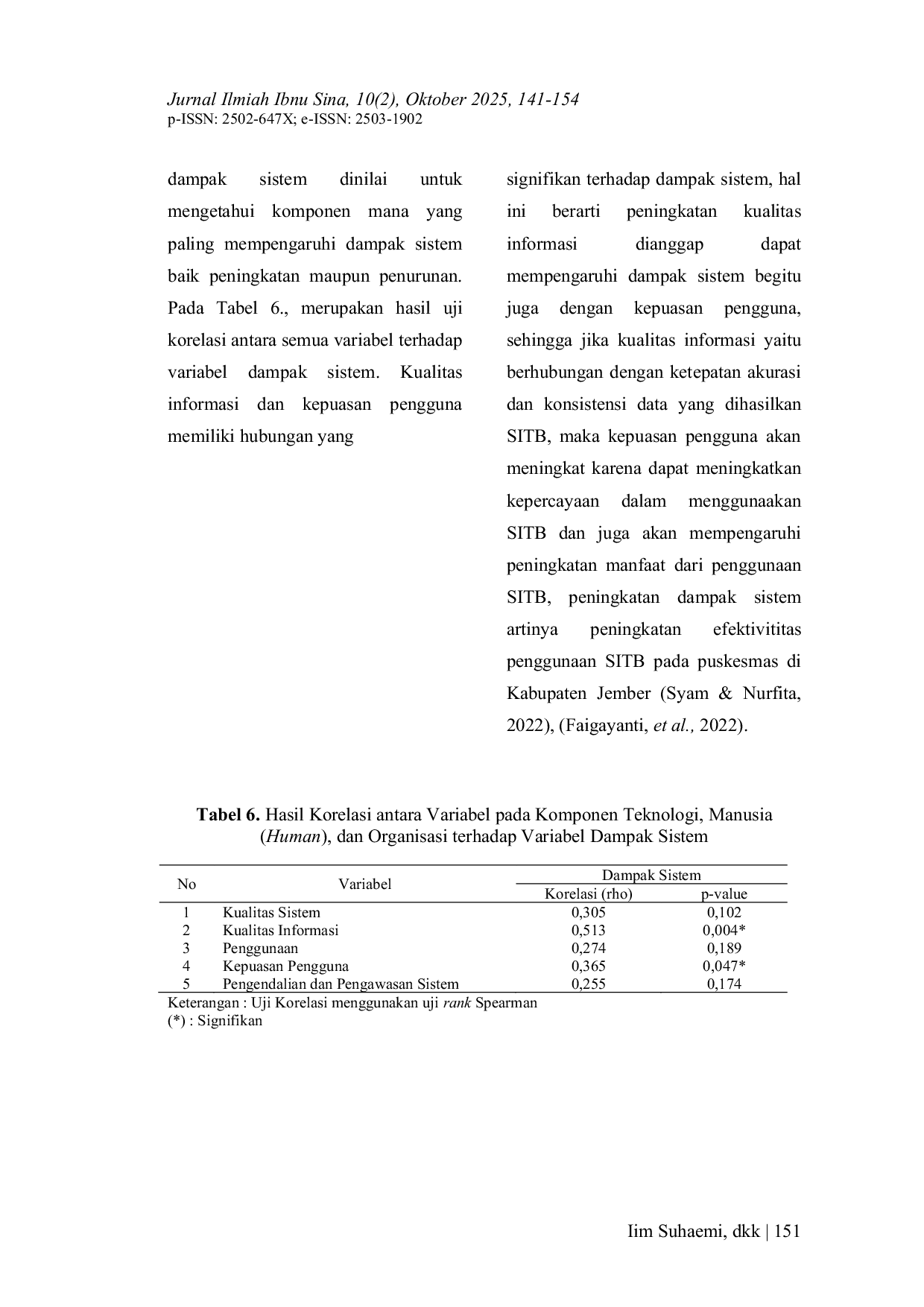 JIIS (Jurnal Ilmiah Ibnu Sina): Ilmu Farmasi dan KesehatanJIIS (Jurnal Ilmiah Ibnu Sina): Ilmu Farmasi dan KesehatanSistem Informasi Tuberkulosis (SITB) merupakan platform strategis untuk logistik TB di fasilitas kesehatan primer, namun optimalisasi pengelolaan penggunaanya masih belum optimal. Penelitian ini bertujuan menganalisis efektivitas penggunaan SITB dan dampaknya terhadap ketersediaan logistik TB pada puskesmas di Kabupaten Jember. Penelitian ini menggunakan desain cross-sectional pada 30 puskesmas di Kabupaten Jember periode Juli-Desember 2024 dengan pemilihan sampel menggunakan purposive sampling. Variabel bebas terdiri dari variabel pada komponen teknologi, organisasi dan human, variabel terikat merupakan dampak sistem. Evaluasi efektivitas menggunakan model HOT-Fit (Human-Organization-Technology), hubungan antar komponen dianalisis menggunakan uji rank spearman. Berdasarkan hasil penelitian, meskipun SITB diterapkan sejak tahun 2020, ketersediaan logistik pada puskesmas di Kabupaten Jember masih belum merata, yaitu masih terjadi kekosongan lebih dari standar (> 4%), pada logistik Non-OAT ketersediaan rata-rata pada periode triwulan cenderung berlebih (> 150%). Analisis korelasi menunjukkan bahwa kualitas informasi dan kepuasan pengguna mempengaruhi dampak sistem secara signifikan (p < 0,05). Sehingga dapat disimpulkan bahwa implementasi SITB belum dapat menjamin pemerataan ketersediaan logistik TB di Puskesmas Kabupaten Jember, dimana pada penggunaan SITB variabel kualitas informasi dan variabel kepuasan pengguna merupakan faktor utama yang mempengaruhi dampak sistem.