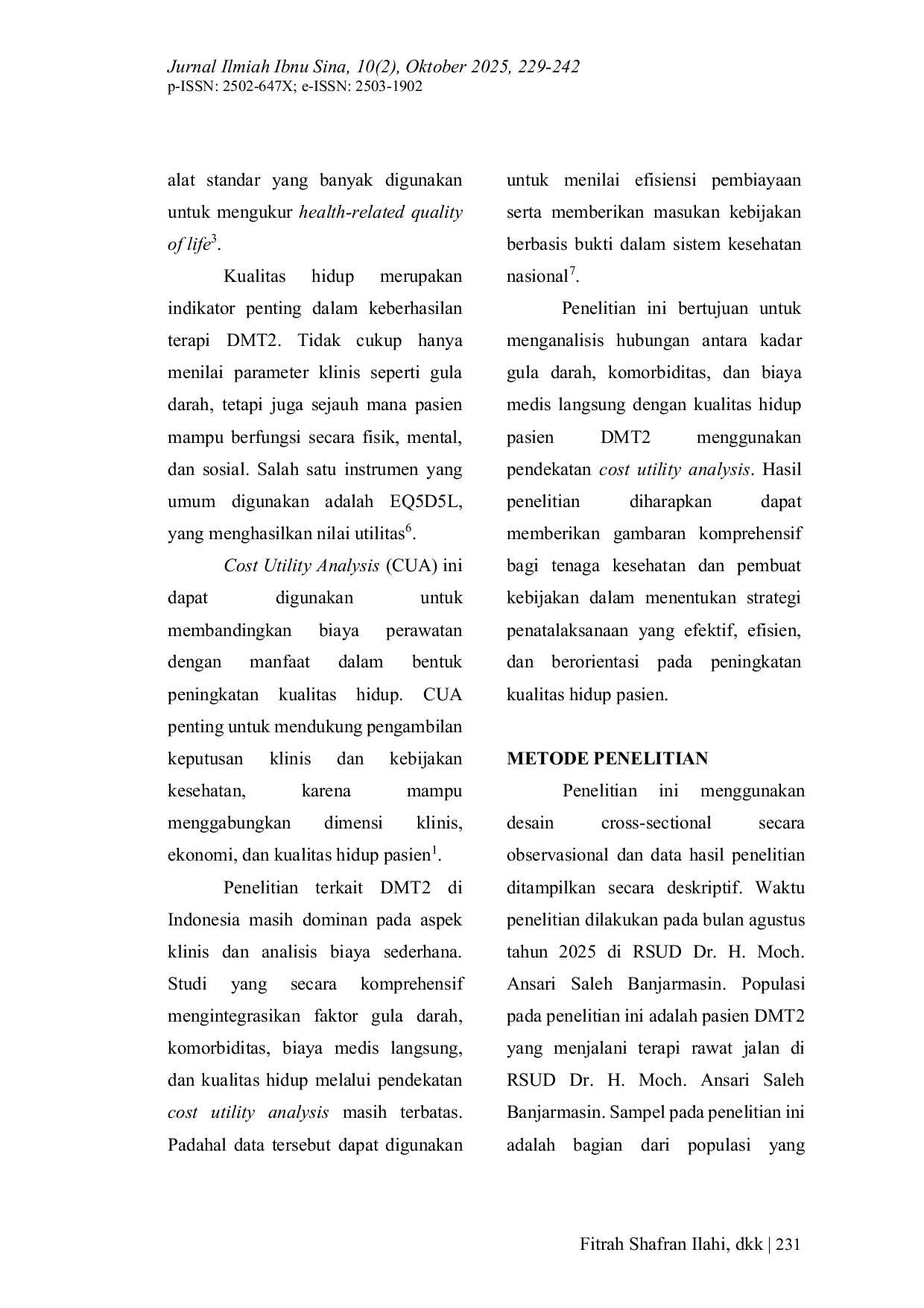 JIIS (Jurnal Ilmiah Ibnu Sina): Ilmu Farmasi dan KesehatanJIIS (Jurnal Ilmiah Ibnu Sina): Ilmu Farmasi dan KesehatanDiabetes mellitus Tipe 2 (DMT2) merupakan salah satu penyakit kronis dengan prevalensi tinggi di Indonesia dan memberikan beban besar terhadap biaya kesehatan. Komorbiditas serta kontrol gula darah yang buruk berkontribusi meningkatkan biaya medis langsung dan penurunan kualitas hidup. Penelitian ini bertujuan untuk melihat Cost Utility Analysis pada pasien DMT2 dengan mengintegrasikan kadar gula darah, komorbiditas, biaya medis langsung, dan kualitas hidup. Metode penelitian ini menggunakan desain cross-sectional dengan pengambilan data secara prospektif menggunakan teknik pengambilan data convenience sampling menggunakan kuisioner EQ5D5L untuk mengukur kualitas hidup, Rekam Medis untuk data gula darah, komorbiditas, serta biaya medis langsung. Analisis data menggunakan uji statistik dengan uji Chi-Square dan uji Regresi Logistik, serta perhitungan nilai indeks utility. Hasil penelitian menunjukkan bahwa 38% memiliki kualitas hidup baik dan 62% memiliki kualitas hidup buruk, dengan rata-rata skor indeks utility 0,5175. kadar gula darah sewaktu sebanyak 56% dengan kadar ≥200 mg/dL, sedangkan <200 mg/dL sebanyak 44%. Adanya Komorbiditas sebanyak 52% sedangkan tidak ada komorbiditas sebanyak 48%. Biaya medis langsung diperoleh median sebesar Rp.425.500, kategori tinggi ≥Rp425.500 sebanyak 62% dan 38% pada kategori rendah Kualitas hidup pasien diabetes mellitus tipe 2 (DMT2) di RSUD Dr.Ansari Saleh secara umum berada pada kategori buruk dengan rata-rata indeks utilitas 0,5175.Meskipun analisis bivariat menunjukkan komorbiditas, kadar gula darah, dan biaya medis langsung berhubungan signifikan dengan kualitas hidup, namun analisis multivariat membuktikan bahwa hanya kadar gula darah yang menjadi faktor independen paling berpengaruh.Hal ini menekankan pentingnya pengendalian kadar gula darah untuk meningkatkan kualitas hidup pasien DMT2. Penelitian ini memberikan gambaran penting mengenai kualitas hidup pasien diabetes mellitus tipe 2 dan faktor-faktor yang memengaruhinya, khususnya kadar gula darah. Untuk memperkaya pemahaman ini, ada beberapa arah penelitian lanjutan yang dapat dieksplorasi. Pertama, akan sangat bermanfaat untuk melakukan studi jangka panjang (longitudinal) guna melacak bagaimana perubahan kadar gula darah yang terkontrol secara konsisten, serta penanganan komorbiditas dan biaya medis, benar-benar memengaruhi kualitas hidup pasien dari waktu ke waktu. Hal ini dapat membantu mengidentifikasi efektivitas intervensi dalam jangka panjang dan memahami dinamika kualitas hidup pasien. Kedua, mengingat temuan bahwa aspek psikologis seperti kecemasan sangat dominan, penelitian selanjutnya bisa berfokus pada evaluasi efektivitas biaya dari program intervensi non-farmakologis yang terstruktur, seperti edukasi pasien yang intensif atau dukungan psikososial, terhadap peningkatan kualitas hidup pada pasien DMT2 dengan kontrol gula darah yang buruk. Ini akan memberikan bukti berbasis data tentang program mana yang paling efektif dan efisien untuk diimplementasikan. Ketiga, untuk meningkatkan generalisasi temuan, studi serupa dapat diperluas ke berbagai fasilitas kesehatan primer dan sekunder di beberapa wilayah di Indonesia. Dengan membandingkan hasil antara berbagai lingkungan perawatan, kita dapat mengidentifikasi perbedaan kualitas hidup pasien dan faktor-faktor pendorongnya dalam konteks sistem kesehatan yang lebih luas, sehingga rekomendasi kebijakan dapat disesuaikan secara lebih spesifik. Penelitian-penelitian ini diharapkan dapat memberikan wawasan lebih mendalam bagi tenaga kesehatan dan pembuat kebijakan dalam merancang strategi penatalaksanaan DMT2 yang holistik dan berkelanjutan, tidak hanya berfokus pada klinis tetapi juga kualitas hidup pasien.