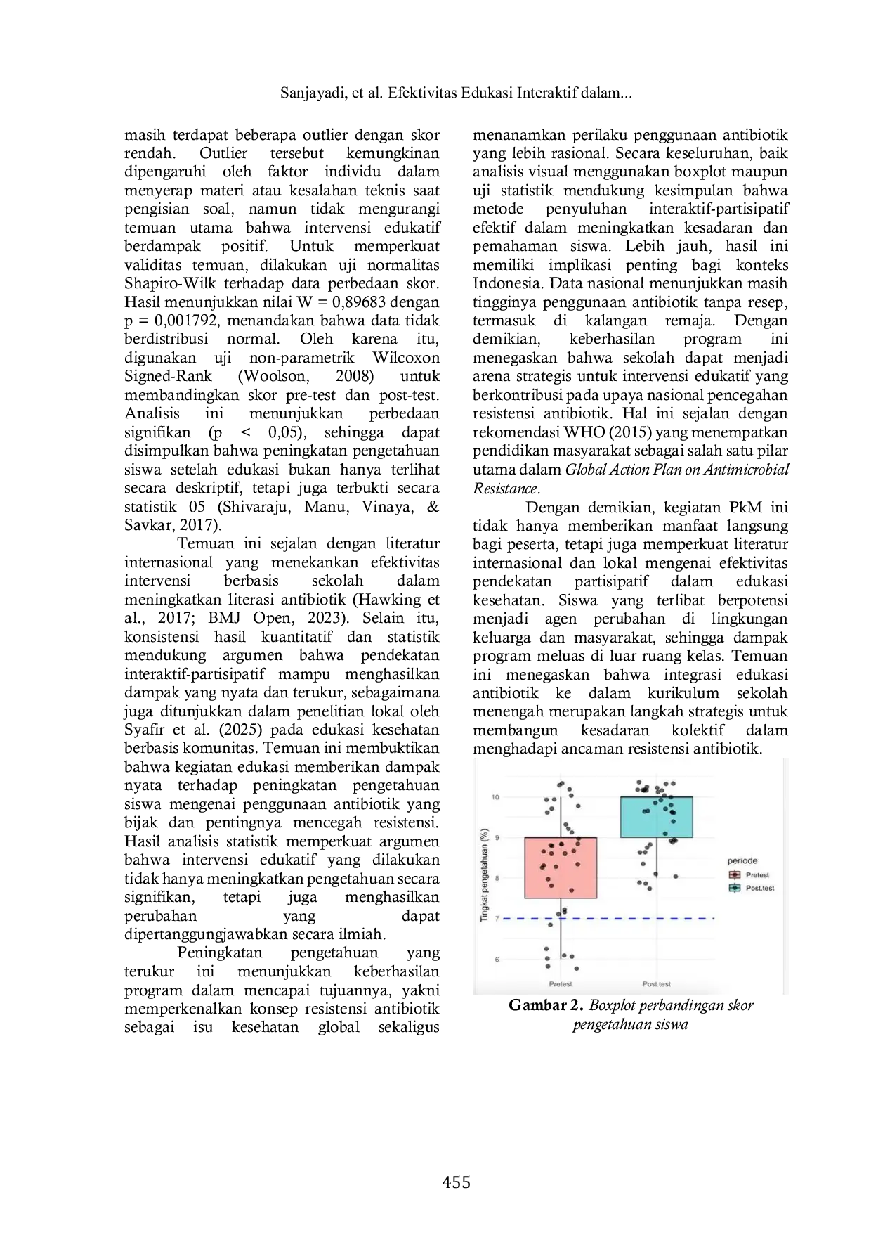 CARADDECARADDEPenyalahgunaan antibiotik di kalangan generasi muda menjadi masalah kesehatan global yang signifikan, yang dapat berujung pada resistensi antibiotik. Pengetahuan yang tepat mengenai penggunaan antibiotik yang bijak sangat penting untuk mencegah fenomena ini. Tujuan: Kegiatan pengabdian kepada masyarakat ini bertujuan untuk meningkatkan pemahaman siswa SMA Pelita 2 Jakarta mengenai penggunaan antibiotik yang tepat dan bahaya resistensi antibiotik. Metode: Kegiatan dilaksanakan dalam satu sesi berdurasi 4 jam, melibatkan 45 siswa, melalui penyuluhan edukatif yang mencakup penyampaian demonstrasi laboratorium, dan permainan edukatif. Evaluasi dilakukan menggunakan pre‑test dan post‑test, serta formulir penilaian berbasis skala Likert untuk menilai kualitas pelaksanaan kegiatan. Analisis perubahan skor pengetahuan dilakukan menggunakan Uji Wilcoxon Signed‑Rank. Hasil: Hasil menunjukkan peningkatan pengetahuan yang signifikan, dengan persentase siswa yang memiliki pengetahuan tinggi meningkat dari 69,77% menjadi 93,00%. Penilaian skala Likert juga menunjukkan skor tinggi dengan skor rata‑rata lebih dari 4 dari 5 pada kategori kejelasan materi, relevansi topik, dan penguasaan materi oleh pemateri. Uji statistik non‑parametrik menunjukkan perbedaan skor yang signifikan antara pre‑test dan post‑test. Kesimpulan: Berdasarkan hasil tersebut, kegiatan edukasi ini terbukti efektif dalam meningkatkan pemahaman siswa mengenai penggunaan antibiotik yang tepat serta risiko resistensi, sekaligus meningkatkan kesadaran mereka akan pentingnya penggunaan antibiotik yang bijak. Edukasi ini juga berpotensi untuk diadaptasi pada sekolah lain sebagai upaya berkelanjutan dalam pencegahan resistensi antibiotik di tingkat masyarakat.