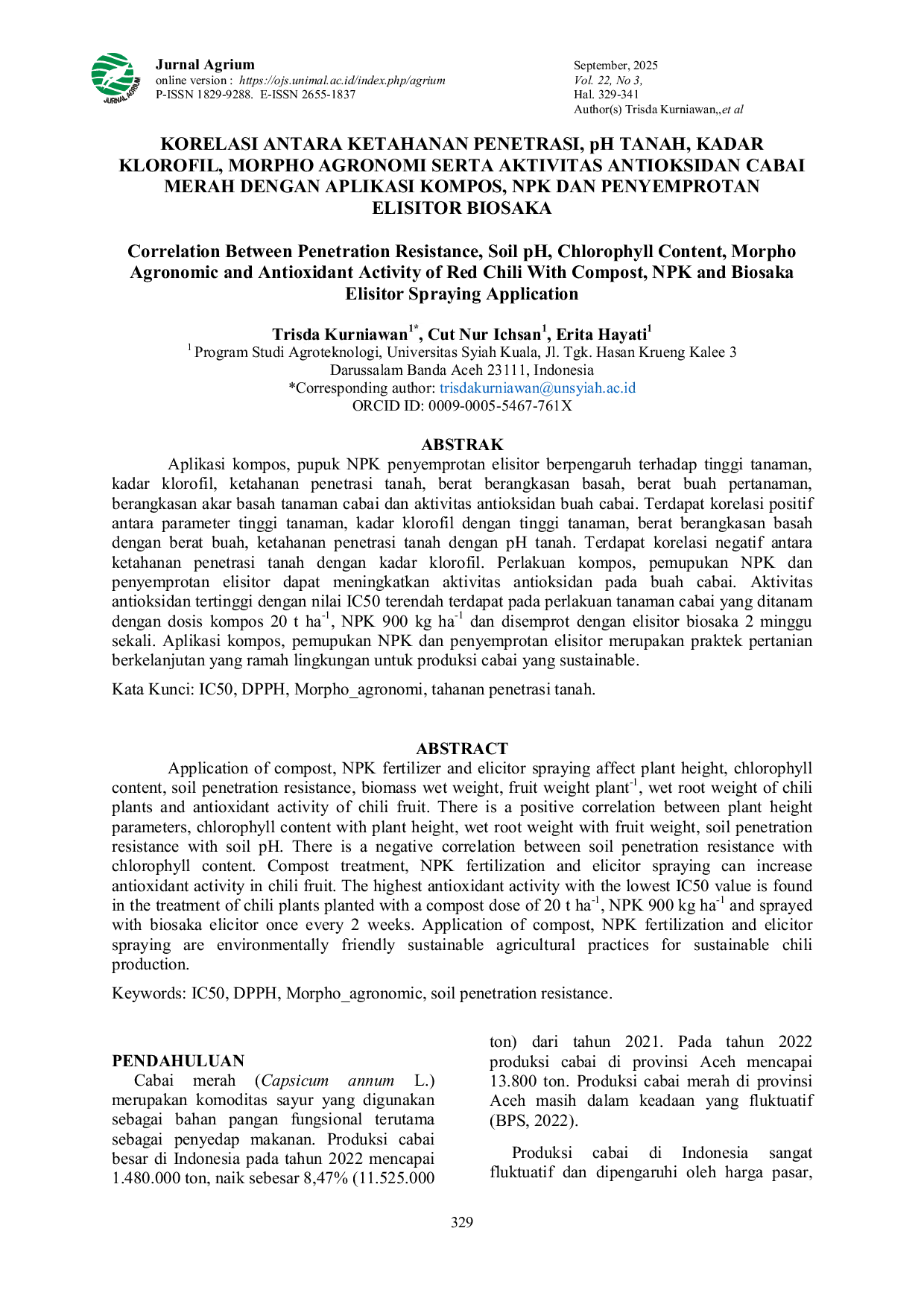 Terdapat korelasi antara ketahanan penetrasi, pH tanah, kadar klorofil dan morpho agronomi serta aktivitas antioksidan cabai merah.Perlakuan kompos, pemupukan NPK dan penyemprotan elisitor mempengaruhi kesuburan tanah, morpho agronomi cabai dan antioksidan buah cabai.Perlakuan kompos 20 ton ha-1, pemupukan NPK 900 kg ha-1 dan penyemprotan elisitor 2 minggu sekali dapat meningkatkan tinggi tanaman, kadar klorofil, berat berangkasan basah dan aktifitas antioksidan buah cabai.