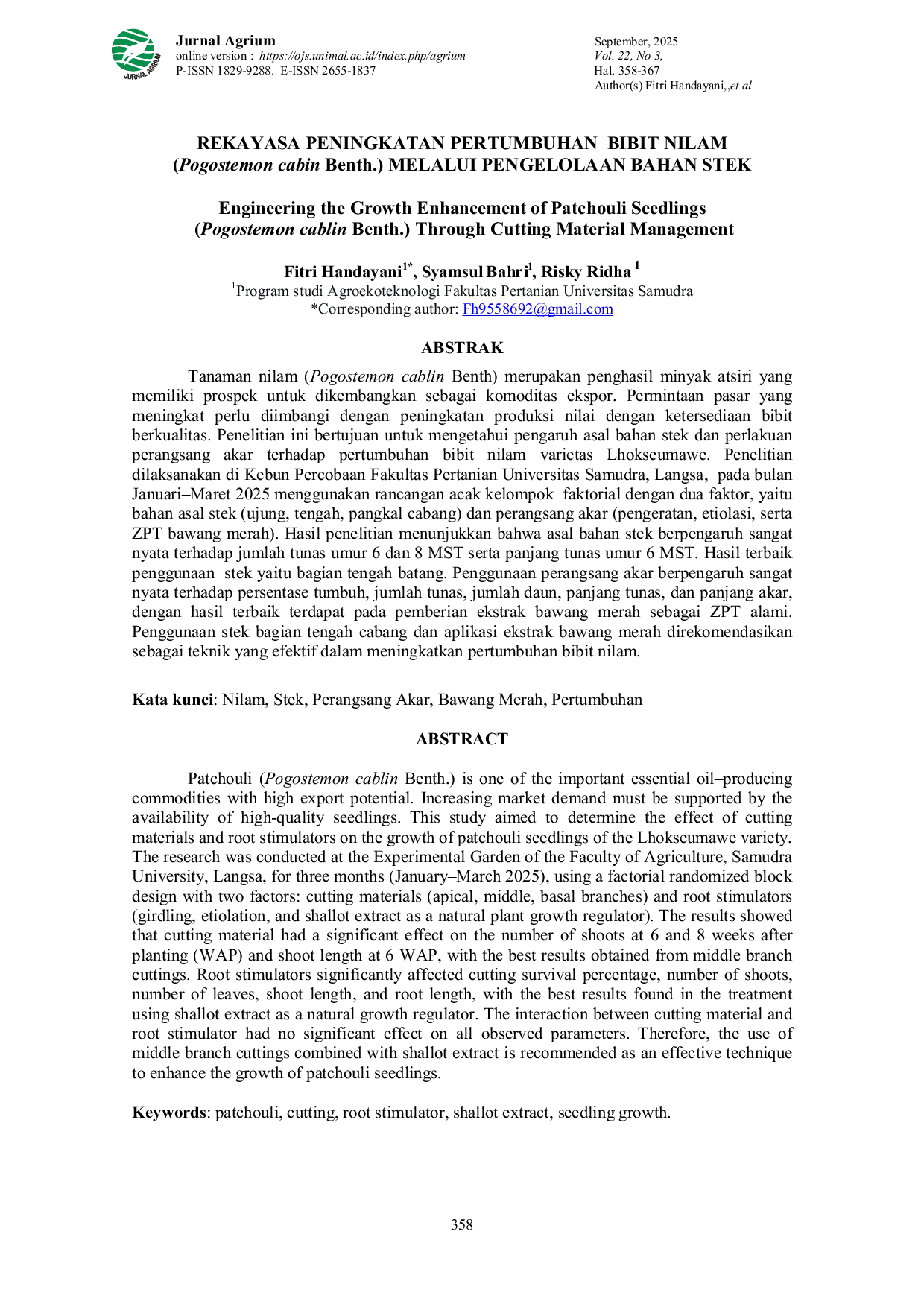 Jurnal AgriumJurnal AgriumTanaman nilam (Pogostemon cablin Benth) merupakan penghasil minyak atsiri yang memiliki prospek untuk dikembangkan sebagai komoditas ekspor. Permintaan pasar yang meningkat perlu diimbangi dengan peningkatan produksi nilai dengan ketersediaan bibit berkualitas. Penelitian ini bertujuan untuk mengetahui pengaruh asal bahan stek dan perlakuan perangsang akar terhadap pertumbuhan bibit nilam varietas Lhokseumawe. Penelitian dilaksanakan di Kebun Percobaan Fakultas Pertanian Universitas Samudra, Langsa, pada bulan Januari–Maret 2025 menggunakan rancangan acak kelompok faktorial dengan dua faktor, yaitu bahan asal stek (ujung, tengah, pangkal cabang) dan perangsang akar (pengeratan, etiolasi, serta ZPT bawang merah). Hasil penelitian menunjukkan bahwa asal bahan stek berpengaruh sangat nyata terhadap jumlah tunas umur 6 dan 8 MST serta panjang tunas umur 6 MST. Hasil terbaik penggunaan stek yaitu bagian tengah batang. Penggunaan perangsang akar berpengaruh sangat nyata terhadap persentase tumbuh, jumlah tunas, jumlah daun, panjang tunas, dan panjang akar, dengan hasil terbaik terdapat pada pemberian ekstrak bawang merah sebagai ZPT alami. Penggunaan stek bagian tengah cabang dan aplikasi ekstrak bawang merah direkomendasikan sebagai teknik yang efektif dalam meningkatkan pertumbuhan bibit nilam.