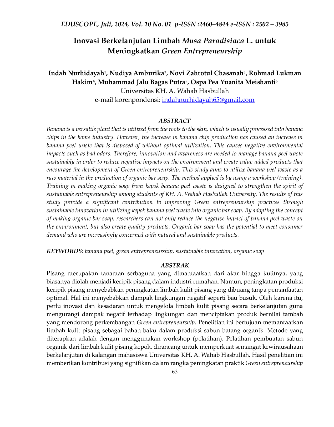 EDUSCOPE: Jurnal Pendidikan, Pembelajaran, dan TeknologiEDUSCOPE: Jurnal Pendidikan, Pembelajaran, dan TeknologiPisang merupakan tanaman serbaguna yang dimanfaatkan dari akar hingga kulitnya, yang biasanya diolah menjadi keripik pisang dalam industri rumahan. Namun, peningkatan produksi keripik pisang menyebabkan peningkatan limbah kulit pisang yang dibuang tanpa pemanfaatan optimal. Hal ini menyebabkan dampak lingkungan negatif seperti bau busuk. Oleh karena itu, perlu inovasi dan kesadaran untuk mengelola limbah kulit pisang secara berkelanjutan guna mengurangi dampak negatif terhadap lingkungan dan menciptakan produk bernilai tambah yang mendorong perkembangan Green entrepreneurship. Penelitian ini bertujuan memanfaatkan limbah kulit pisang sebagai bahan baku dalam produksi sabun batang organik. Metode yang diterapkan adalah dengan menggunakan workshop (pelatihan). Pelatihan pembuatan sabun organik dari limbah kulit pisang kepok, dirancang untuk memperkuat semangat kewirausahaan berkelanjutan di kalangan mahasiswa Universitas KH. A. Wahab Hasbullah. Hasil penelitian ini memberikan kontribusi signifikan dalam rangka peningkatan praktik Green entrepreneurship melalui inovasi berkelanjutan dalam pemanfaatan limbah kulit pisang kepok menjadi sabun batang organik.