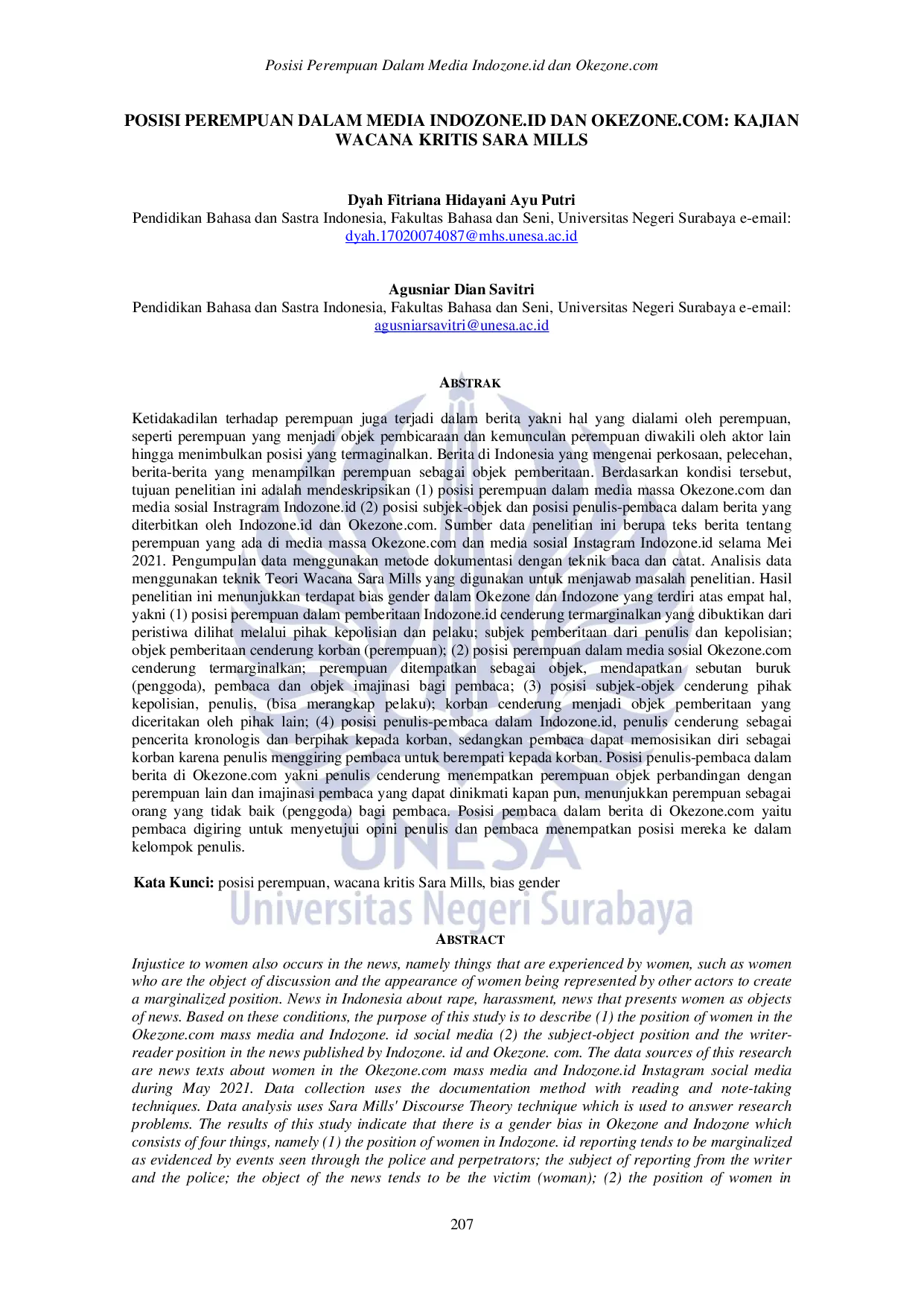 International Journal of Social Science, Educational, Economics, Agriculture Research and Technology (IJSET)International Journal of Social Science, Educational, Economics, Agriculture Research and Technology (IJSET)Ketidakadilan terhadap perempuan juga terjadi dalam berita yakni hal yang dialami oleh perempuan, seperti perempuan yang menjadi objek pembicaraan dan kemunculan perempuan diwakili oleh aktor lain hingga menimbulkan posisi yang termarginalkan. Berita di Indonesia yang mengenai perkosaan, pelecehan, berita-berita yang menampilkan perempuan sebagai objek pemberitaan. Berdasarkan kondisi tersebut, tujuan penelitian ini adalah mendeskripsikan (1) posisi perempuan dalam media massa Okezone.com dan media sosial Instagram Indozone.id (2) posisi subjek-objek dan posisi penulis-pembaca dalam berita yang diterbitkan oleh Indozone.id dan Okezone.com. Sumber data penelitian ini berupa teks berita tentang perempuan yang ada di media massa Okezone.com dan media sosial Instagram Indozone.id selama Mei 2021. Pengumpulan data menggunakan metode dokumentasi dengan teknik baca dan catat. Analisis data menggunakan teknik Teori Wacana Sara Mills yang digunakan untuk menjawab masalah penelitian. Hasil penelitian ini menunjukkan terdapat bias gender dalam Okezone dan Indozone yang terdiri atas empat hal, yakni (1) posisi perempuan dalam pemberitaan Indozone.id cenderung termarginalkan yang dibuktikan dari peristiwa dilihat melalui pihak kepolisian dan pelaku; subjek pemberitaan dari penulis dan kepolisian; objek pemberitaan cenderung korban (perempuan); (2) posisi perempuan dalam media sosial Okezone.com termarginalkan; perempuan ditempatkan sebagai objek, mendapatkan sebutan buruk cenderung (penggoda), pembaca dan objek imajinasi bagi pembaca; (3) posisi subjek-objek cenderung pihak kepolisian, penulis, (bisa merangkap pelaku); korban cenderung menjadi objek pemberitaan yang diceritakan oleh pihak lain; (4) posisi penulis-pembaca dalam Indozone.id, penulis cenderung sebagai pencerita kronologis dan berpihak kepada korban, sedangkan pembaca dapat memosisikan diri sebagai korban karena penulis menggiring pembaca untuk berempati kepada korban. Posisi penulis-pembaca dalam berita di Okezone.com yakni penulis cenderung menempatkan perempuan objek perbandingan dengan perempuan lain dan imajinasi pembaca yang dapat dinikmati kapan pun, menunjukkan perempuan sebagai orang yang tidak baik (penggoda) bagi pembaca. Posisi pembaca dalam berita di Okezone.com yaitu pembaca digiring untuk menyetujui opini penulis dan pembaca menempatkan posisi mereka ke dalam kelompok penulis.