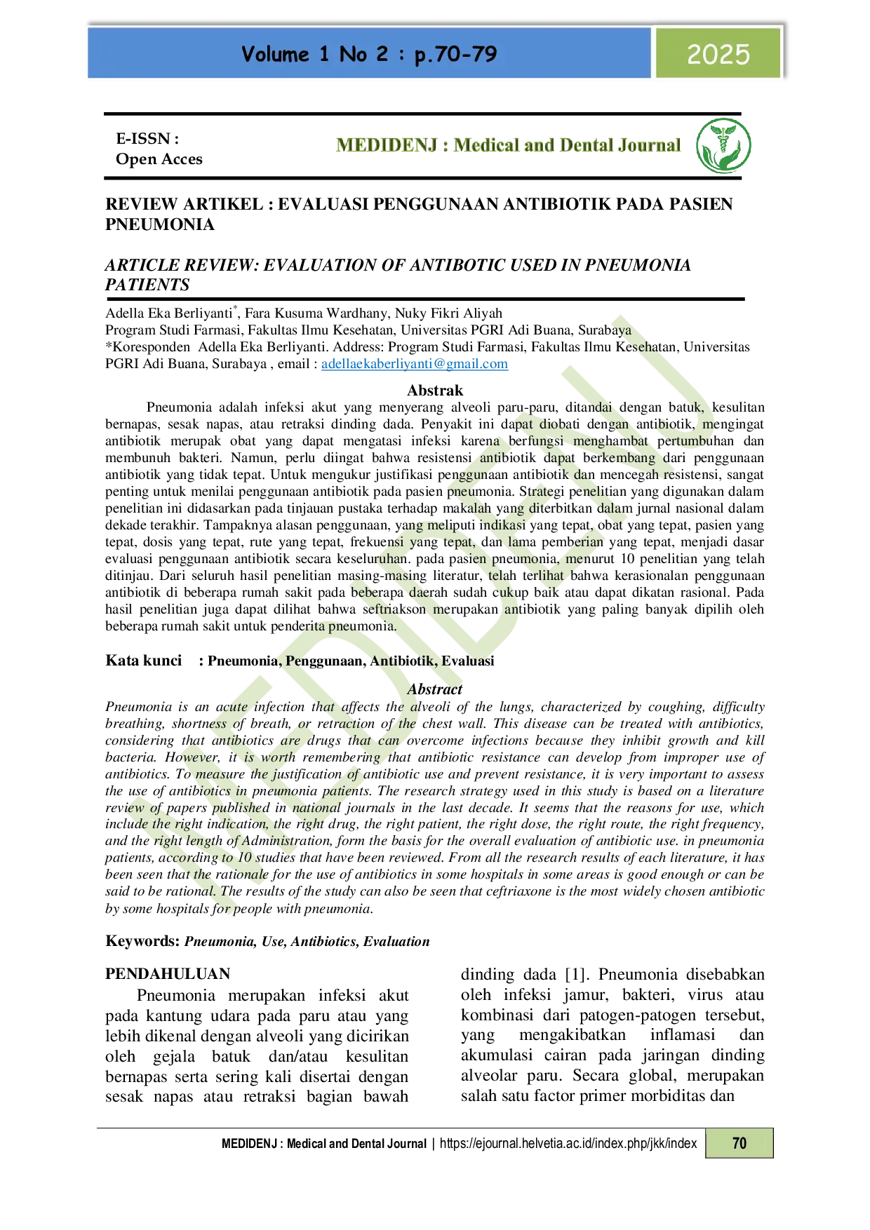 Medical and Dental Journal ( MEDIDENJ )Medical and Dental Journal ( MEDIDENJ )Pneumonia adalah infeksi akut yang menyerang alveoli paru-paru, ditandai dengan batuk, kesulitan bernapas, sesak napas, atau retraksi dinding dada. Penyakit ini dapat diobati dengan antibiotik, mengingat antibiotik merupakan obat yang dapat mengatasi infeksi karena berfungsi menghambat pertumbuhan dan membunuh bakteri. Namun, perlu diingat bahwa resistensi antibiotik dapat berkembang dari penggunaan antibiotik yang tidak tepat. Untuk mengukur justifikasi penggunaan antibiotik dan mencegah resistensi, sangat penting untuk menilai penggunaan antibiotik pada pasien pneumonia. Strategi penelitian yang digunakan dalam penelitian ini didasarkan pada tinjauan pustaka terhadap makalah yang diterbitkan dalam jurnal nasional dalam dekade terakhir. Tampaknya alasan penggunaan, yang meliputi indikasi yang tepat, obat yang tepat, pasien yang tepat, dosis yang tepat, rute yang tepat, frekuensi yang tepat, dan lama pemberian yang tepat, menjadi dasar evaluasi penggunaan antibiotik secara keseluruhan pada pasien pneumonia, menurut 10 penelitian yang telah ditinjau. Dari seluruh hasil penelitian masing-masing literatur, telah terlihat bahwa kerasionalan penggunaan antibiotik di beberapa rumah sakit pada beberapa daerah sudah cukup baik atau dapat dikatakan rasional. Pada hasil penelitian juga dapat dilihat bahwa seftriakson merupakan antibiotik yang paling banyak dipilih oleh beberapa rumah sakit untuk penderita pneumonia.