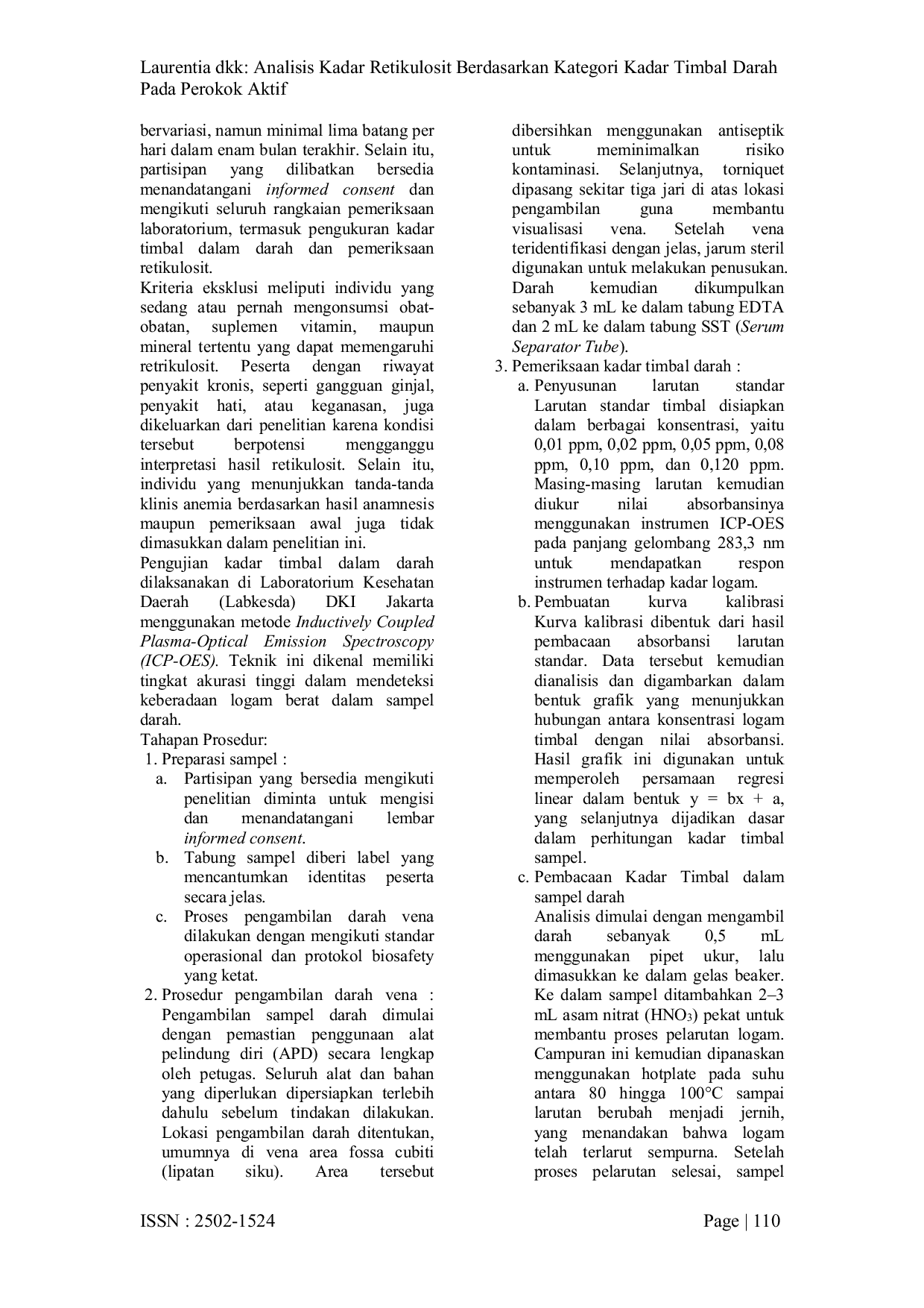 Journal of Nursing and HealthJournal of Nursing and HealthPendahuluan Kandungan timbal (Pb) dalam asap rokok merupakan salah satu faktor yang berpotensi mengganggu keseimbangan mikronutrien tubuh, termasuk zat besi. Timbal yang terhirup melalui paru-paru dapat masuk ke dalam sistem sirkulasi darah, berikatan dengan eritrosit, dan menghambat proses pembentukan sel darah (hematopoiesis). Akumulasi timbal dalam tubuh perokok aktif diduga dapat memengaruhi produksi retikulosit, yang merupakan indikator regenerasi eritrosit. Penelitian ini bertujuan untuk menganalisis perbedaan kadar retikulosit pada perokok aktif berdasarkan status kadar timbal darah. Penelitian menggunakan desain observasional analitik dengan pendekatan potong lintang dan melibatkan 20 responden perokok aktif yang dipilih melalui teknik purposive sampling. Metode Kadar timbal darah diukur menggunakan metode Inductively Coupled Plasma-Optical Emission Spectroscopy, sedangkan pemeriksaan retikulosit dilakukan secara manual di laboratorium. Hasil menunjukkan bahwa 5 dari 20 responden (25 %) memiliki kadar timbal darah melebihi ambang batas ≥5 µg/dL sesuai kriteria National Institute for Occupational Safety and Health, dan 3 responden (15%) menunjukkan kadar retikulosit yang meningkat. Karena data tidak berdistribusi normal, uji Mann-Whitney U digunakan, menghasilkan nilai signifikansi p = 0,826. Hasil Temuan ini mengindikasikan tidak terdapat perbedaan yang signifikan secara statistik pada kadar retikulosit antara kelompok dengan kadar timbal darah normal dan tinggi. Kesimpulan Dengan demikian, kadar timbal yang meningkat belum terbukti secara signifikan berpengaruh terhadap kadar retikulosit pada populasi penelitian ini.
